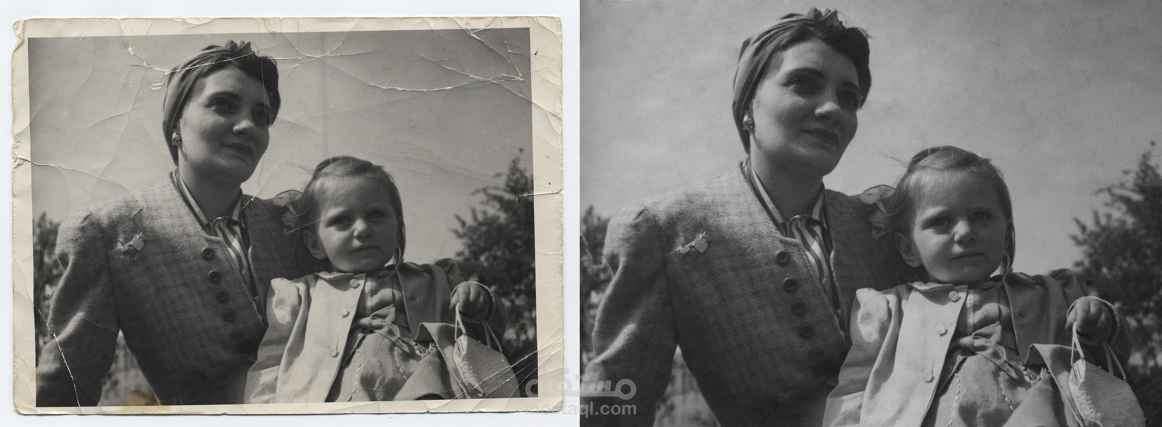 صورة قديمة متضررة بتظهر عليها آثار الزمن، ثم نفس الصورة بعد عملية ترميم احترافية أعادتها إلى حالتها الأصلية بشكل أوضح وأنقى، مع الحفاظ على التفاصيل والجو العاطفي للصورة.