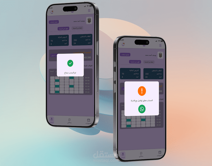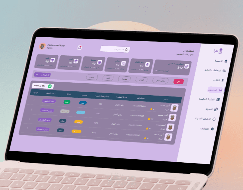 على الجانب الآخر، تم تصميم تجربة متكاملة للمعلمين تمكنهم من التسجيل بسهولة، إضافة بياناتهم الأساسية، إدارة مواعيدهم، متابعة الحجوزات، والتواصل مع الطلاب مباشرة عبر نظام محادثة داخلي. كما تتاح لهم إمكانية إدارة دخلهم وسحب مستحقاتهم بطريقة منظمة.