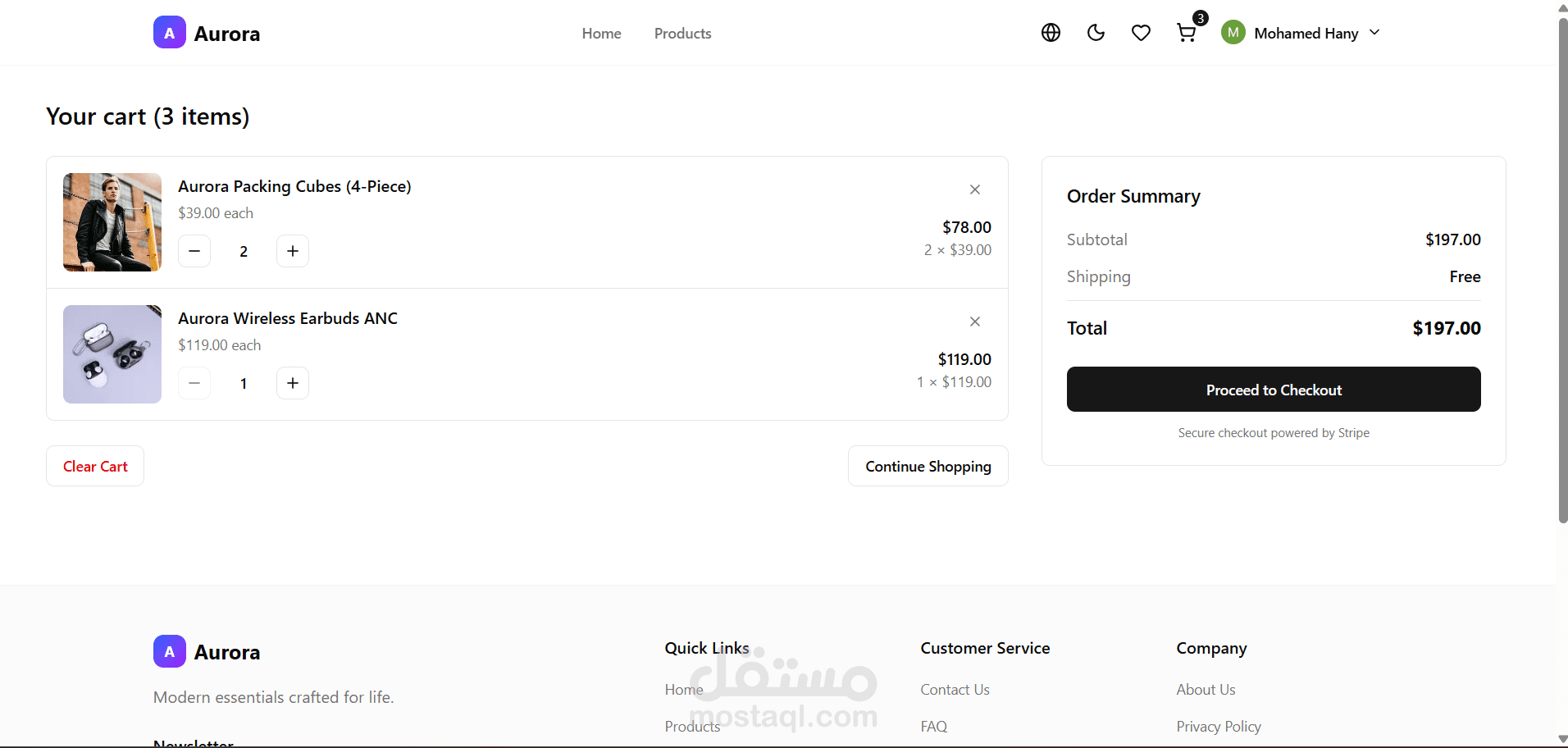 - تكامل مع Stripe (أو مزوّد بديل) لإنشاء جلسات دفع آمنة، والتعامل مع Webhooks لتأكيد الدفع وتحديث الطلبات.