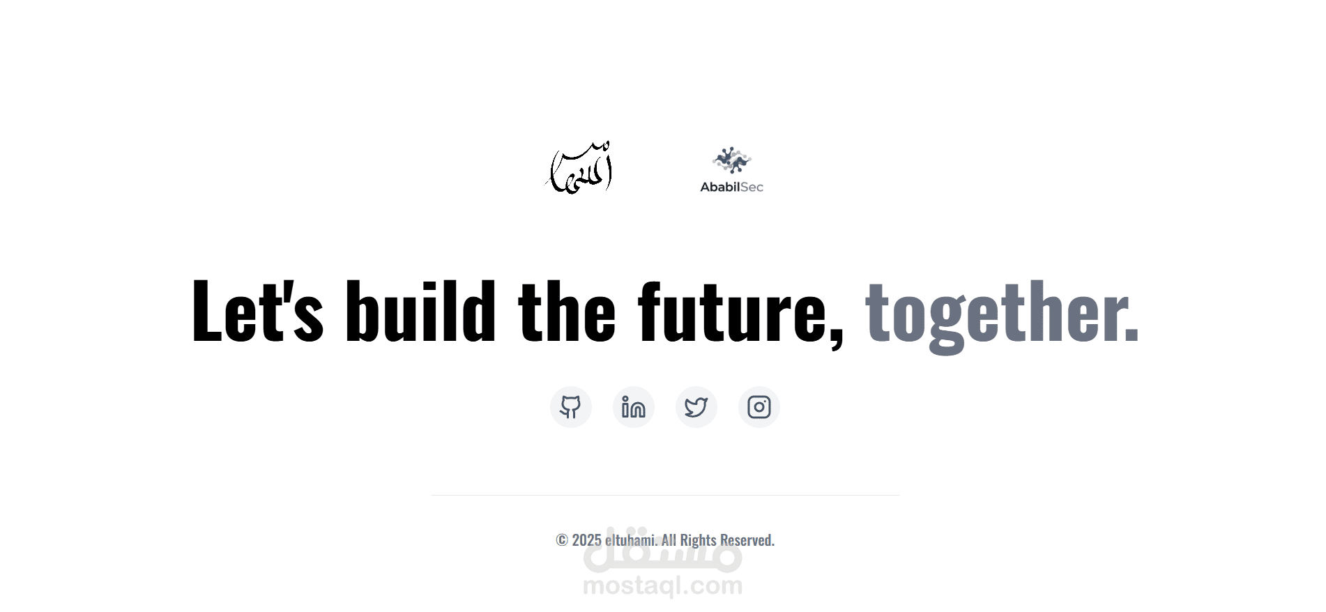 يحتوي الموقع على نموذج اتصال ضمن قسم “Get in Touch”، ما يسمح للزوار بالتواصل مباشرة لبدء تعاون مشترك. الرسالة الختامية "Let’s build the future, together." تضيف طابعًا شخصيًا ودعوة للتعاون. © 2025 eltuhami.