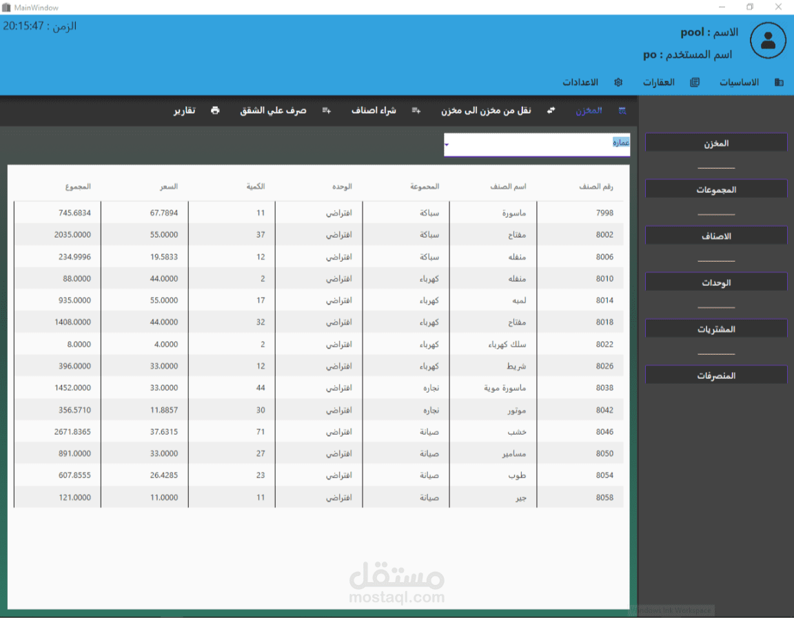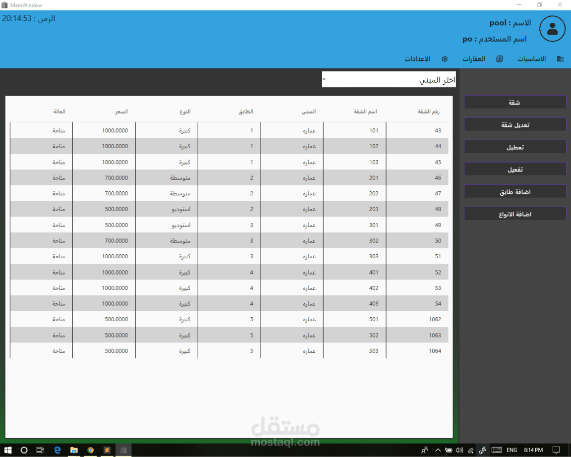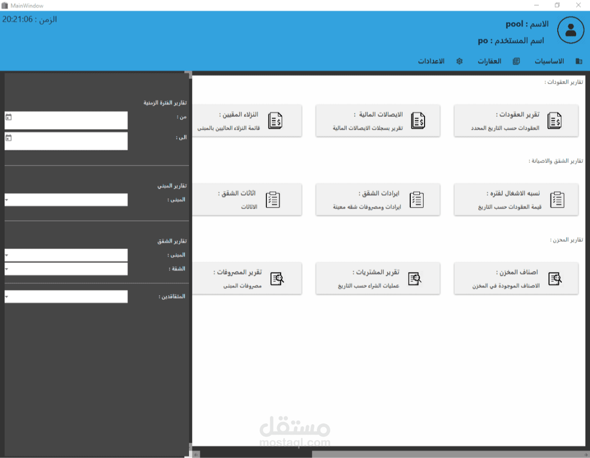 يختص النظام في عده اقسام منها المخزن وفيه تتم عمليات شراء الاثاثات او ادوات الصيانة وتحزينها وايضا قسم المنصرفات وفيه تتم مراقبه الشقق او الغرق التي تم صرف اثاث اوادوات صيانة عليها,, بعد المخزن يوجد المبني وهنا تكون فيه auto generated apartments graph - رسم جرافيك تلقائي للشقق- يعرض فيه الشقق ويظهر ما ازا كانت الشقه مؤجرة فارغة او علي وشك الانتهاء - بعد المبني يوجد قسم العقودات فيه تتم العليات القانونية اللازمة لاجراء عقد من شروط واتفاقيات.... النظام متكامل وبحتوي علي خصائص فرعيه لا استطيع ذكرها its just too much
