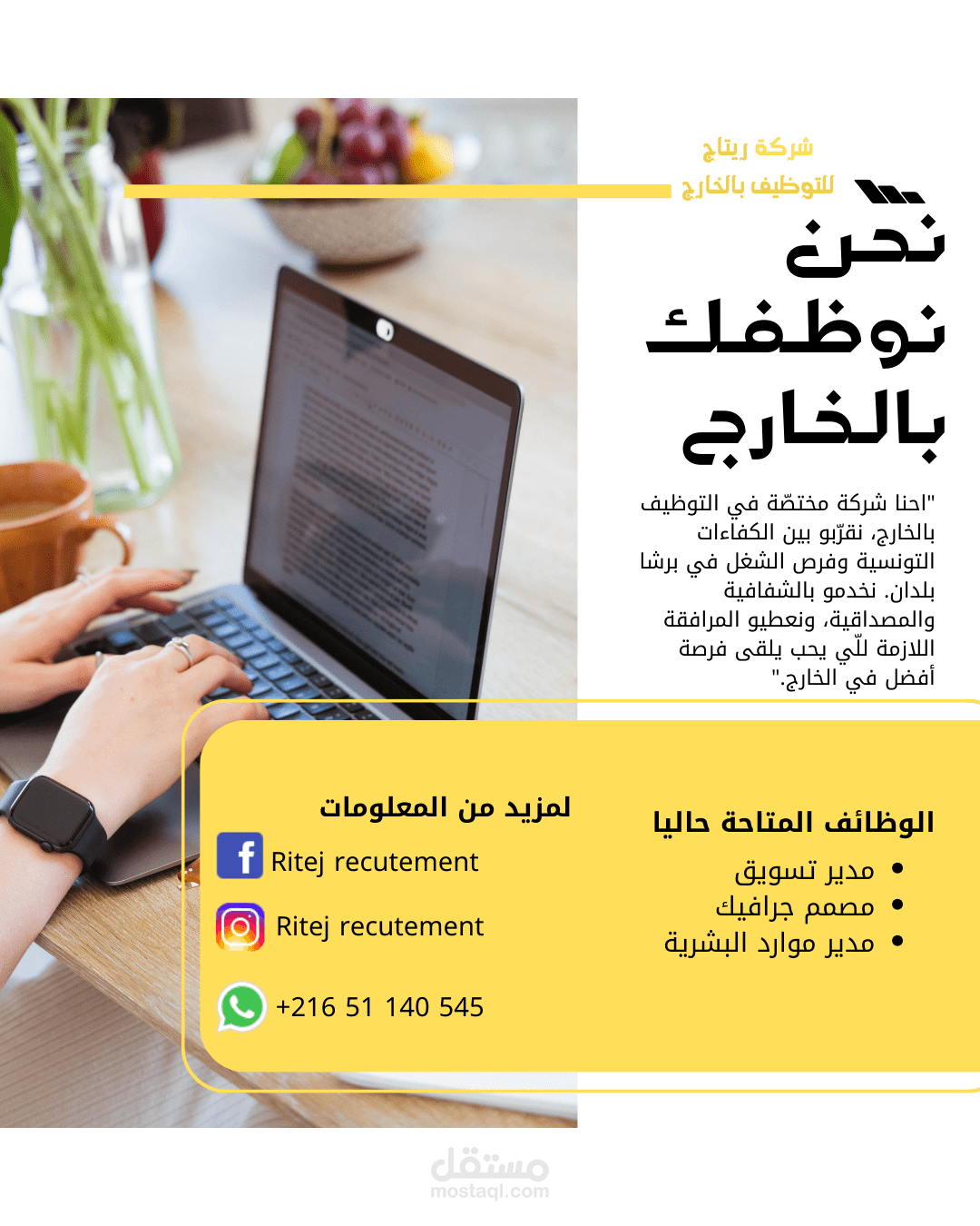 "تصميم منشور دعائي لشركة ريتاج للتوظيف بالخارج، يقدّم عرض الوظائف المتاحة ويُبرز وسائل التواصل الاجتماعي الخاصة بالشركة. التصميم يعتمد على ألوان عصرية وخط واضح لزيادة جاذبية الإعلان وسهولة قراءته."