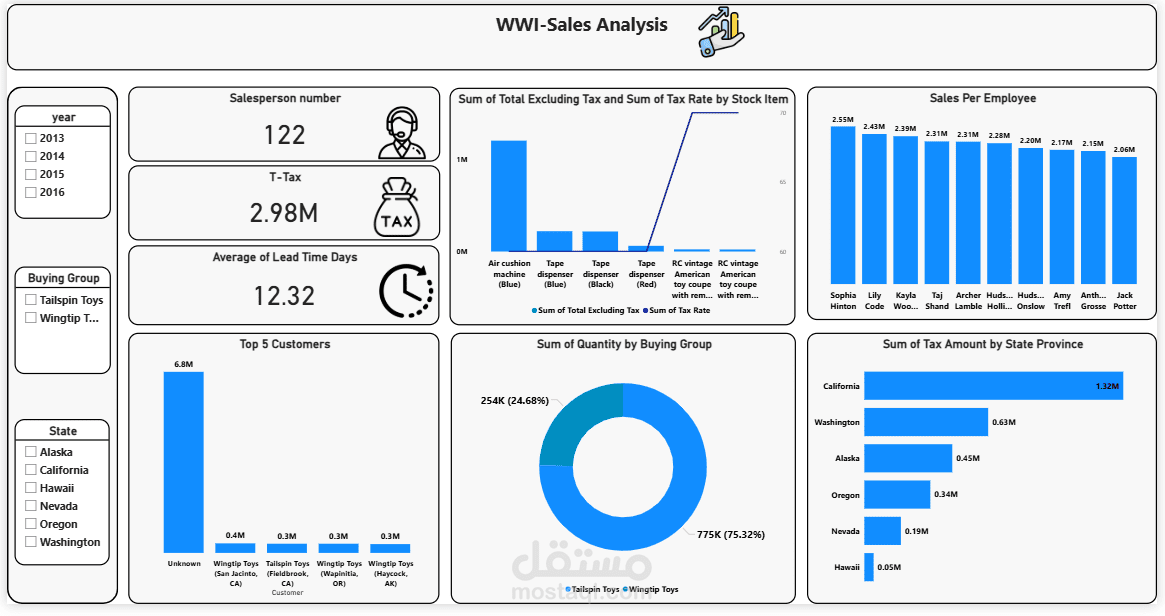 المشروع عبارة عن لوحة تحكم تفاعلية لتحليل المبيعات (WWI Sales Analysis) باستخدام برنامج Power BI.