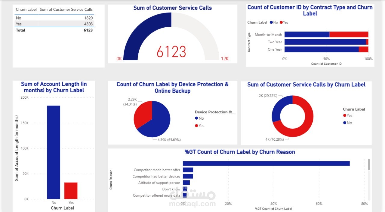 م تصميم هذه اللوحة باستخدام برنامج Power BI لتحليل سلوك العملاء وفهم أسباب فقدانهم (Churn).