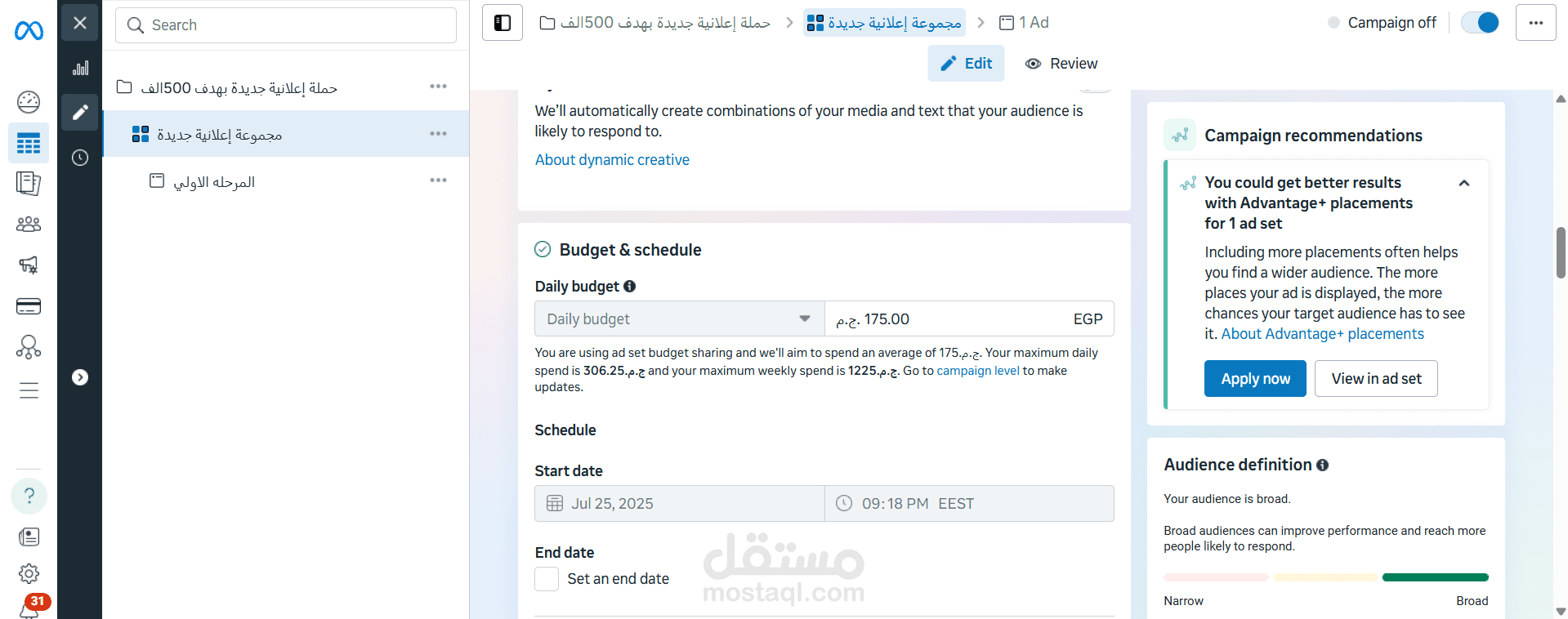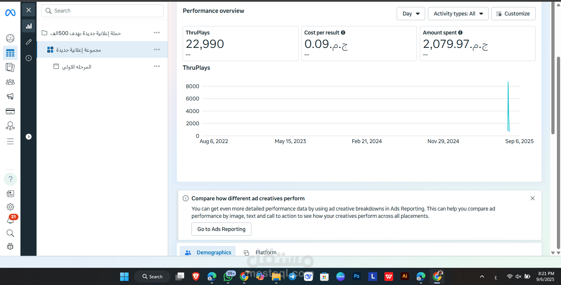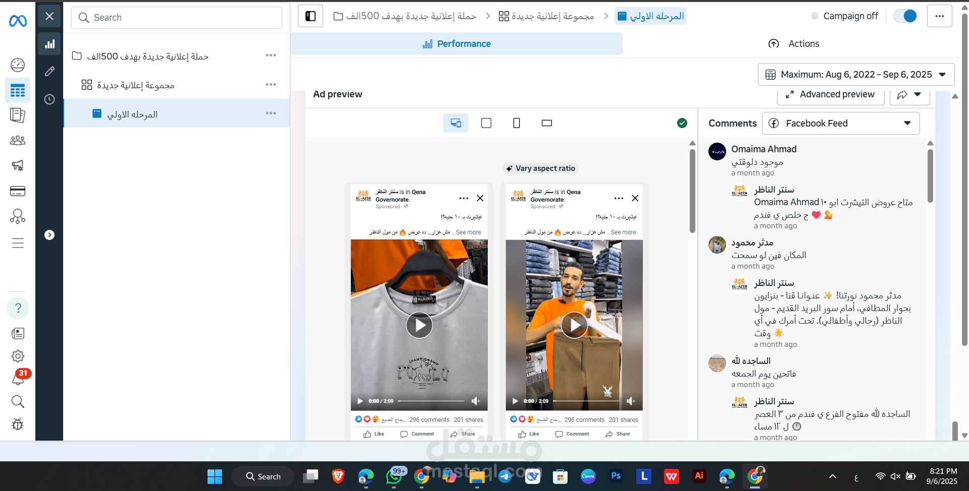 تم إدارة حملة إعلانية ناجحة لمحل الملابس "سنتر الناظر" استهدفت زيادة الوعي والتفاعل من خلال فيديوهات إعلانية جذابة. حققت الحملة 22,990 ThruPlays، وهو عدد المشاهدات التي استمرت حتى النهاية أو لمدة لا تقل عن 15 ثانية، مما يعكس اهتمامًا عميقًا من الجمهور بالمحتوى المقدم. تم تنفيذ الحملة بتكلفة منخفضة لكل نتيجة بلغت 0.09 جنيه، ضمن ميزانية إجمالية قدرها 2,079.97 جنيه.
