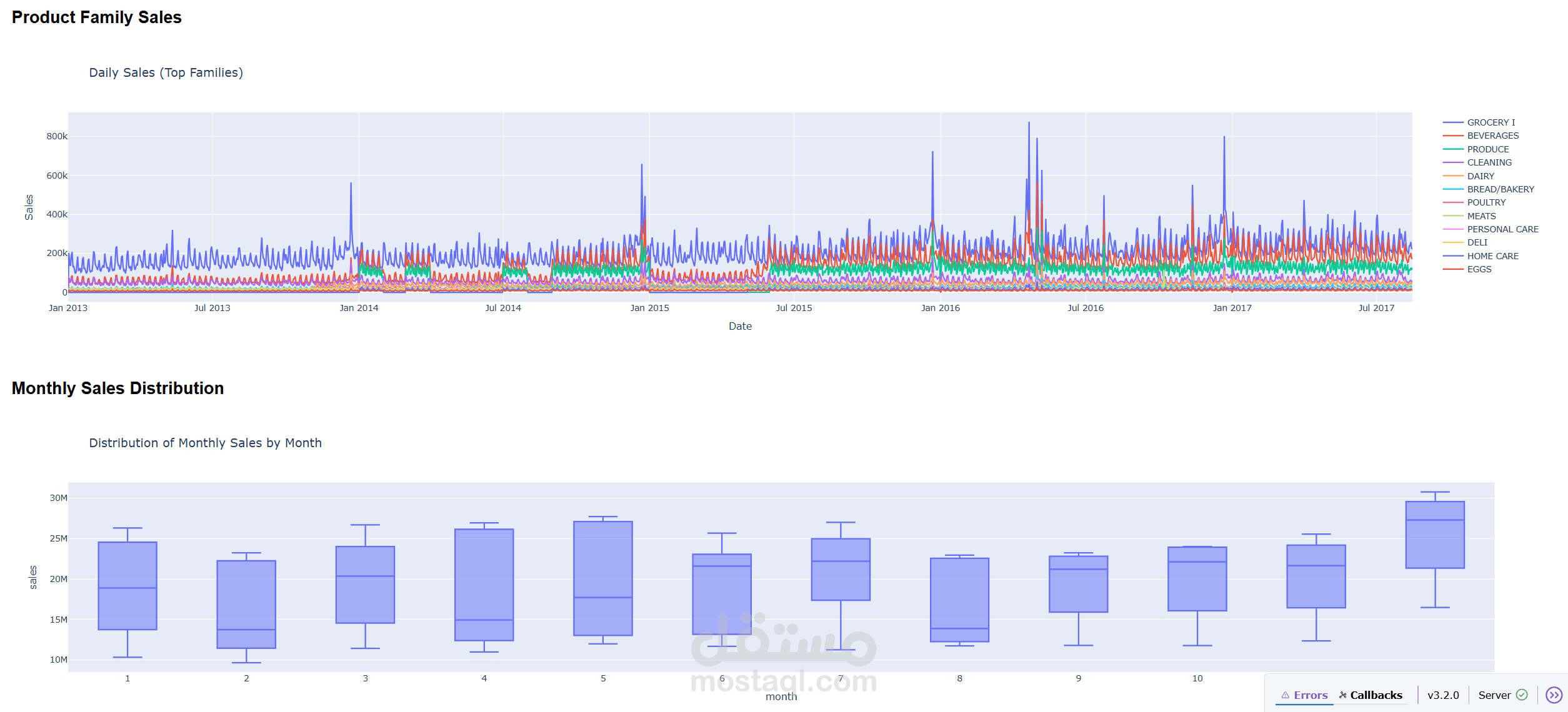 بدأت بتنظيف البيانات ودمج عدة مصادر مثل بيانات المبيعات، المتاجر، المعاملات، العطلات، وأسعار النفط، ثم أجريت تحليلًا شاملًا لتحديد أعلى المتاجر أداءً، العائلات الأكثر مبيعًا، والاتجاهات الشهرية واليومية.
