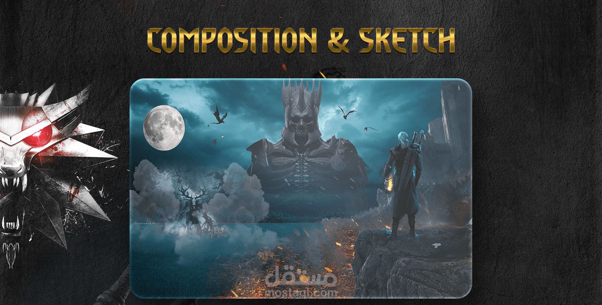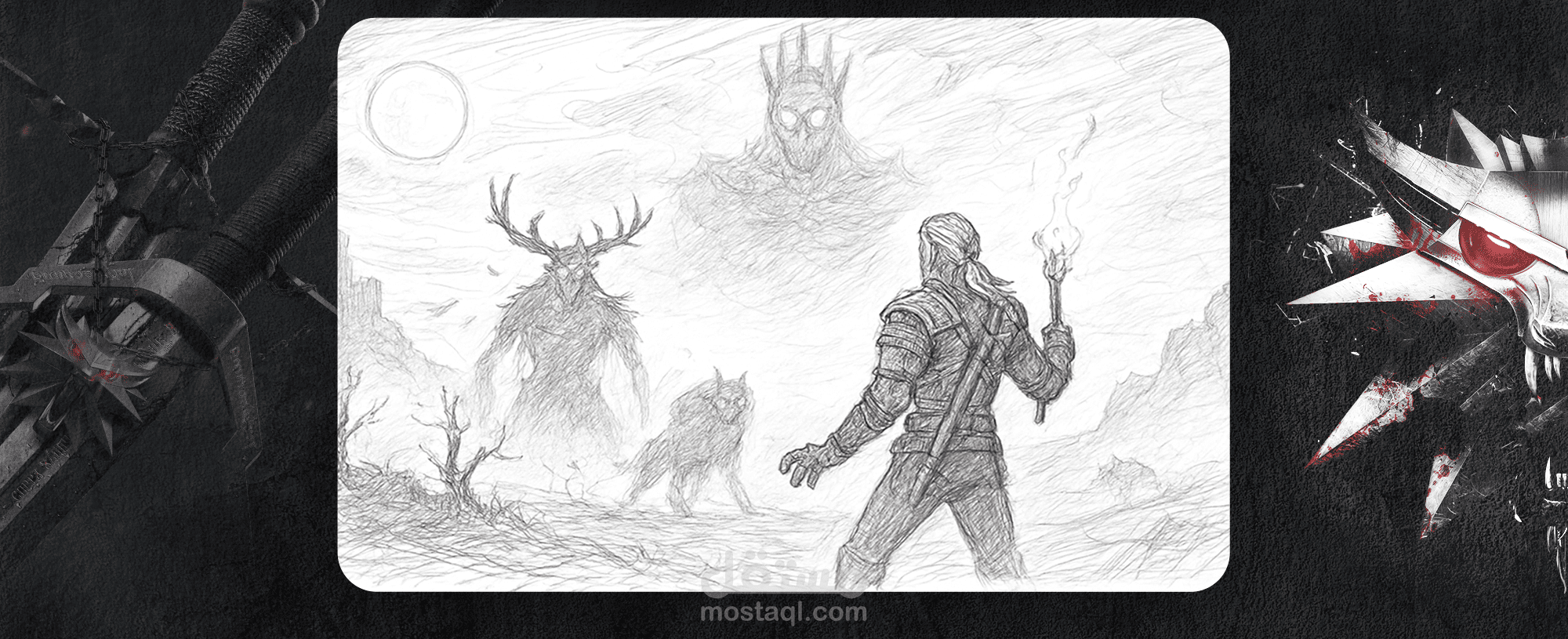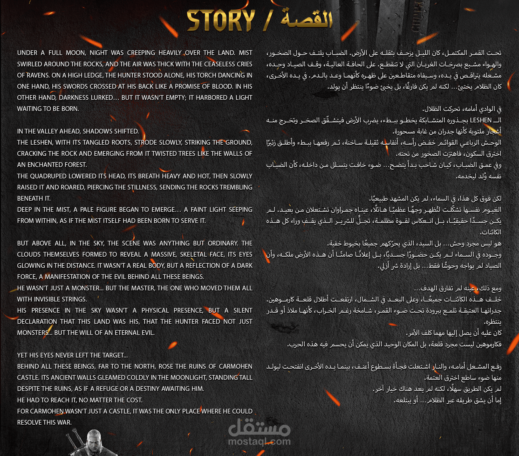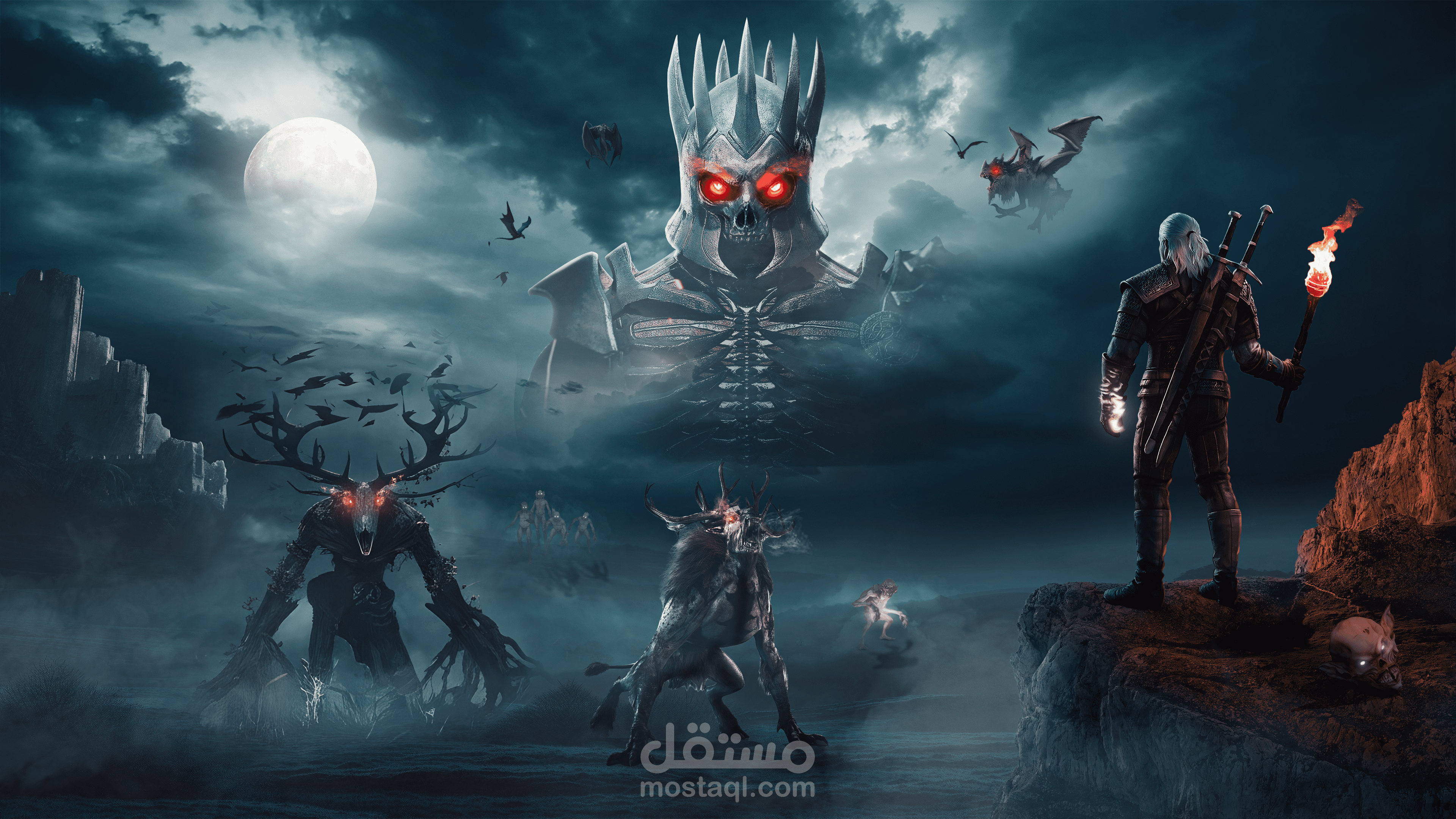 تحت القمر المكتمل، كان الليل يزحف بثقله على الأرض. الضباب يلتف حول الصخور، والهواء مشبع بصرخات الغربان التي لا تنقطع. على الحافة العالية، وقف الصياد وحده، مشعله يتراقص في يده، وسيفاه متقاطعين على ظهره كأنهما وعد بالدم. في يده الأخرى، كان الظلام يختبئ… لكنه لم يكن فارغًا، بل يخبئ ضوءًا ينتظر أن يولد.