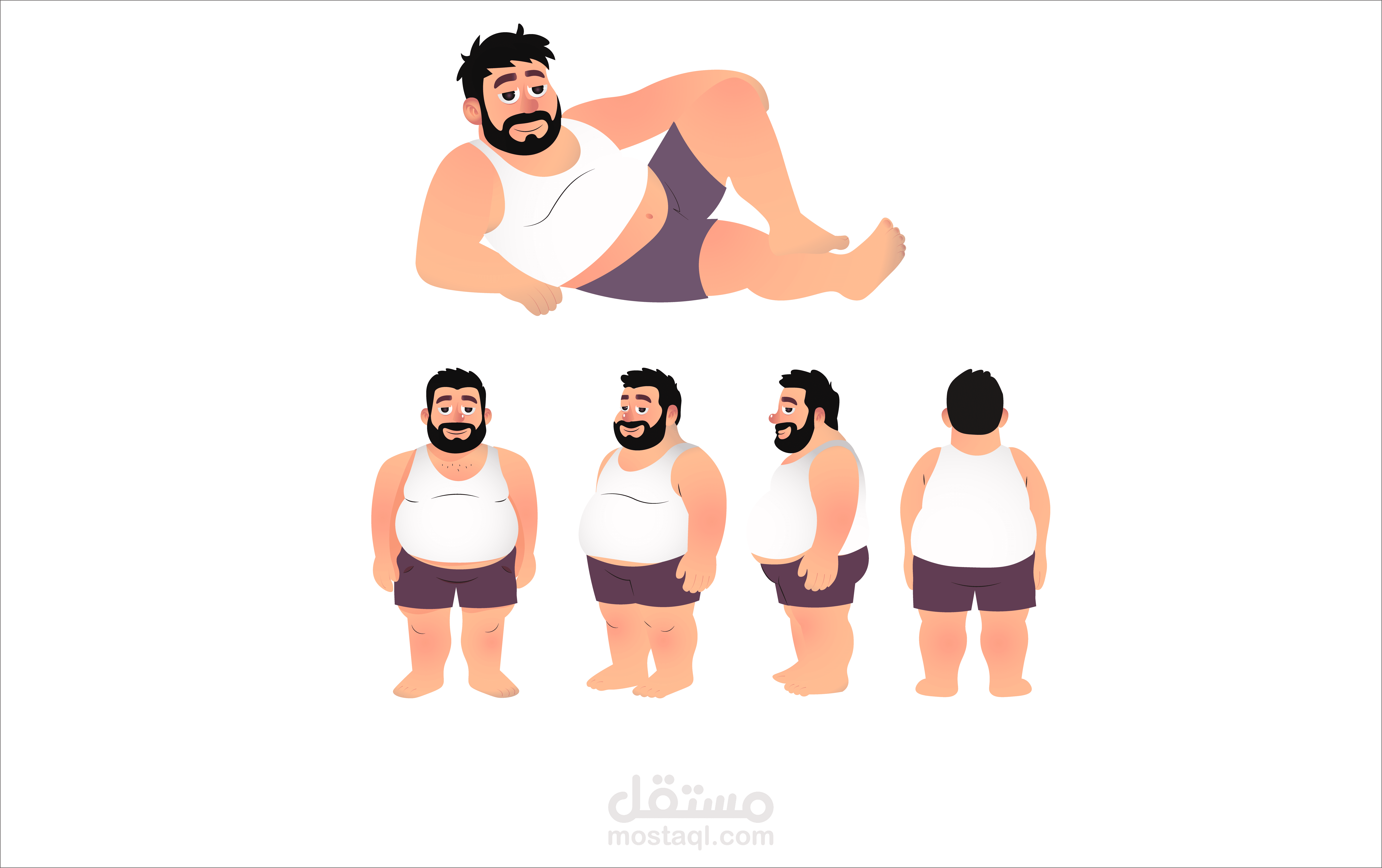 العمل يتضمن Turnaround كامل للشخصية (أمامي – جانبي – خلفي) مع وضعية إضافية لتعكس شخصية الكاركتر بشكل أوضح.