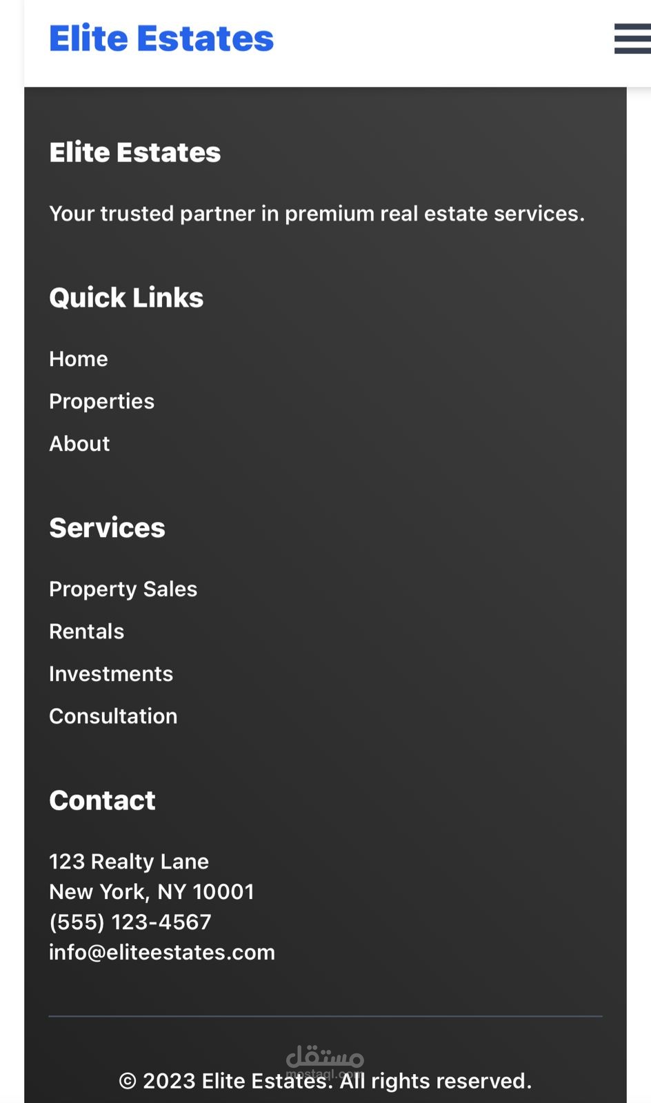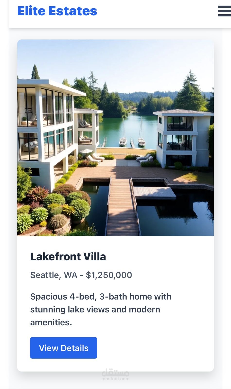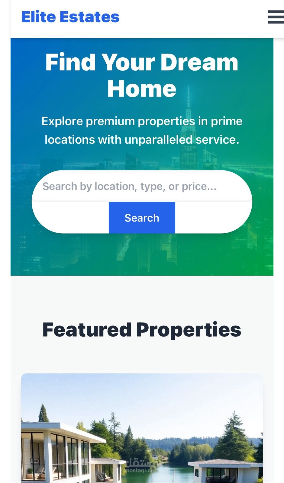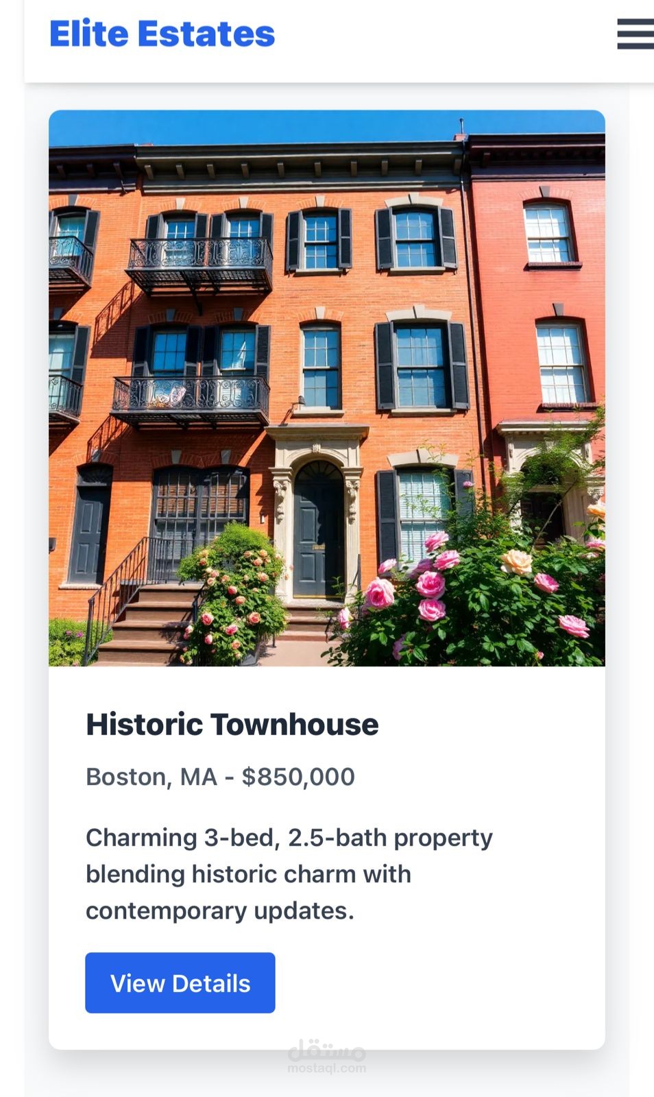 موقع ويب متخصص في مجال العقارات، مصمم بشكل احترافي ومتجاوب مع جميع الأجهزة. يحتوي على صفحة رئيسية جذابة، صفحة لعرض العقارات المتاحة مع تفاصيل وصور، وصفحة للتواصل لتسهيل التواصل المباشر بين العملاء والمهتمين