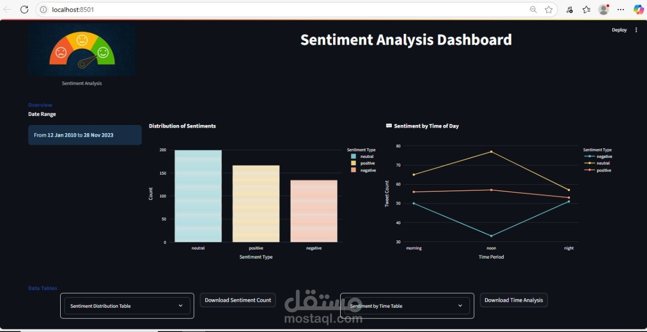 عرض النتائج بشكل مبسط باستخدام رسوم بيانية لتمثيل نسب المشاعر في البيانات.