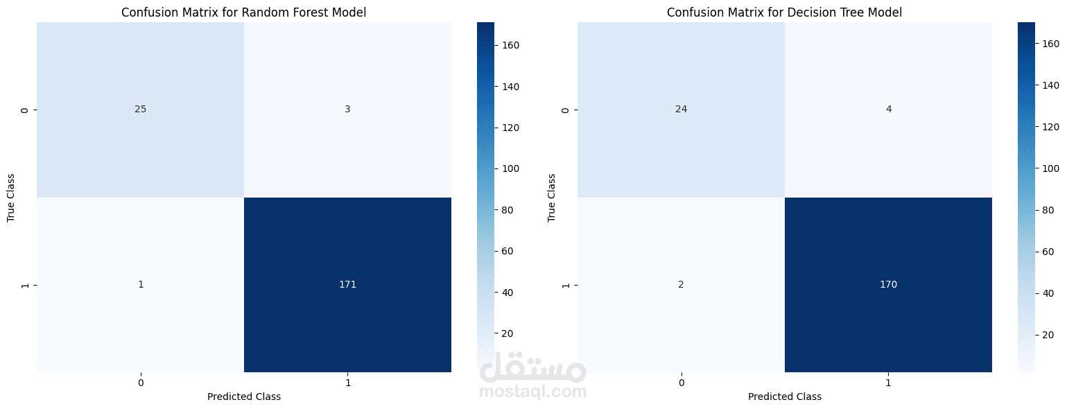 بناء نماذج تعلم الآلة مثل: Random Forest Classifier و Decision Tree Classifier.