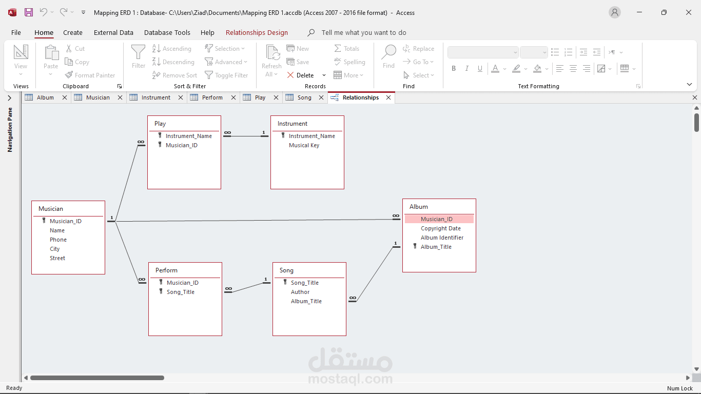 صممت العلاقات المنطقية بين هذه الكيانات، مع تطبيق دقيق لقيود الكاردينالية (Cardinality Constraints) التي تحكم هذه العلاقات (مثل علاقات "متعدد لمتعدد" بين الموسيقيين والآلات، وبين الموسيقيين والأغاني).