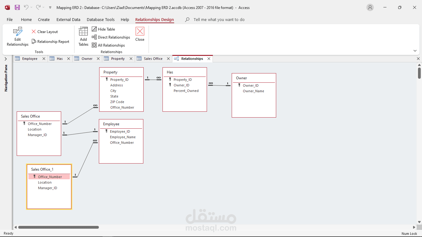 صممت العلاقات المعقدة بين هذه الكيانات، مثل العلاقة بين المكتب والموظفين (واحد لمتعدد)، وعلاقة الإدارة (واحد لواحد بين المكتب والمدير)، والعلاقة بين الملاك والعقارات التي تتضمن سمة للعلاقة (Percent_Owned).