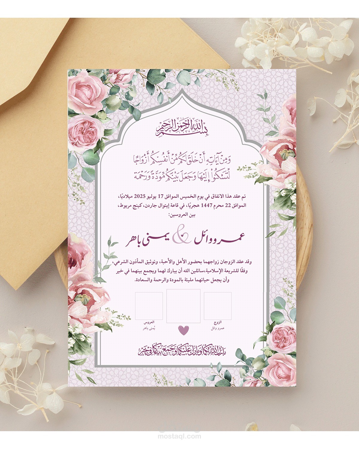 دعوة زفاف مميزة بناء على طلب العميل، وتصميم بصمة كتب الكتاب قابلة للطباعة المحترفة.