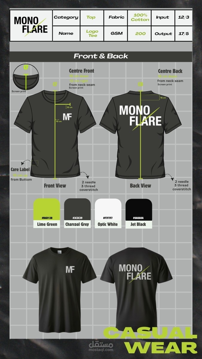 تم تصميم الشعار بخطوط قوية وبسيطة، مع مراعاة أن يكون عمليًا وسهل التطبيق عبر الطباعة (Screen Print) على الملابس والإكسسوارات، مع ثبات الوضوح في مختلف الأحجام والمواقع (مقدمة/خلفية).
