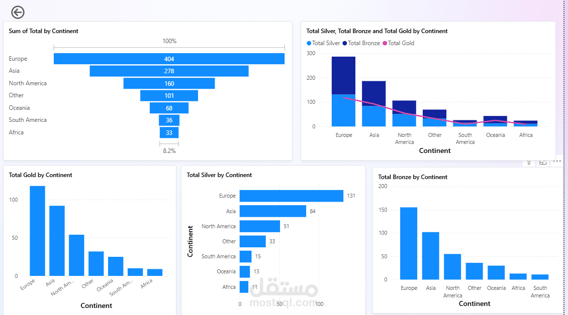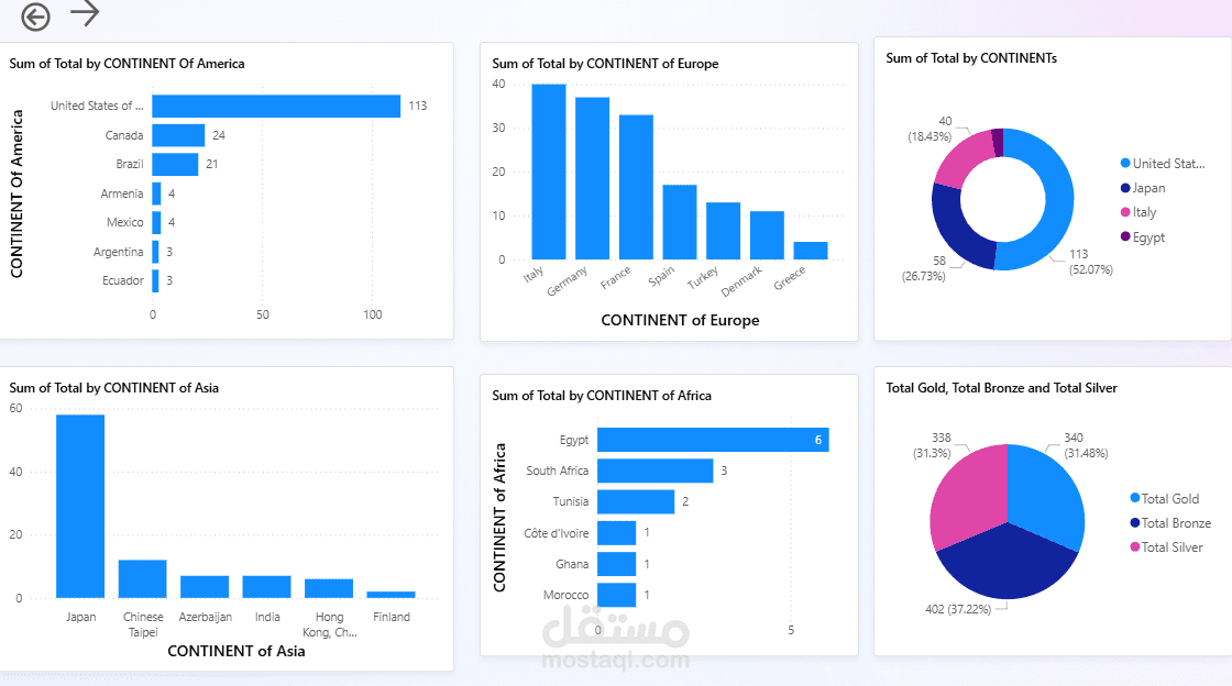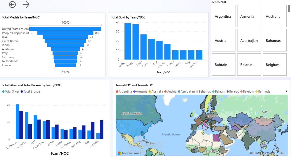 تصميم لوحات معلومات تفاعلية لعرض توزيع الميداليات حسب الدولة، والمشاركة حسب الجنس، والفئات الرياضية.