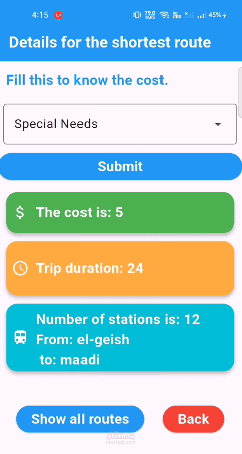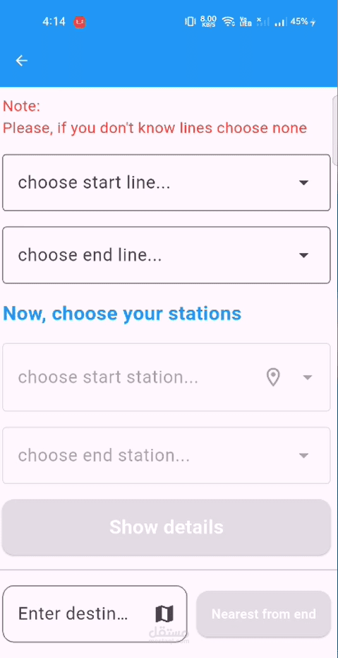 تطبيق لمعرفة محطات المترو يوجد به تحديد محطة البداية والنهاية ويبحث عن اقصر طريق ويعرض عدد المحطات و سعر التذكرة