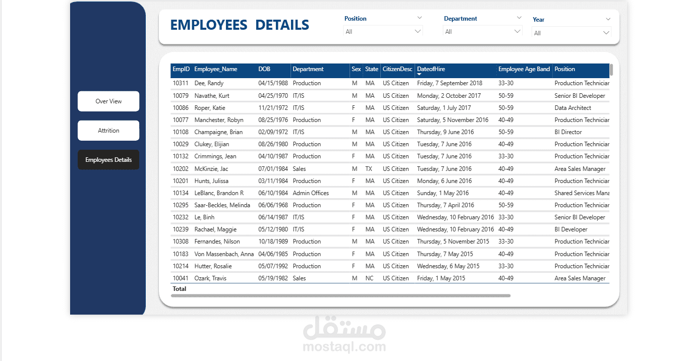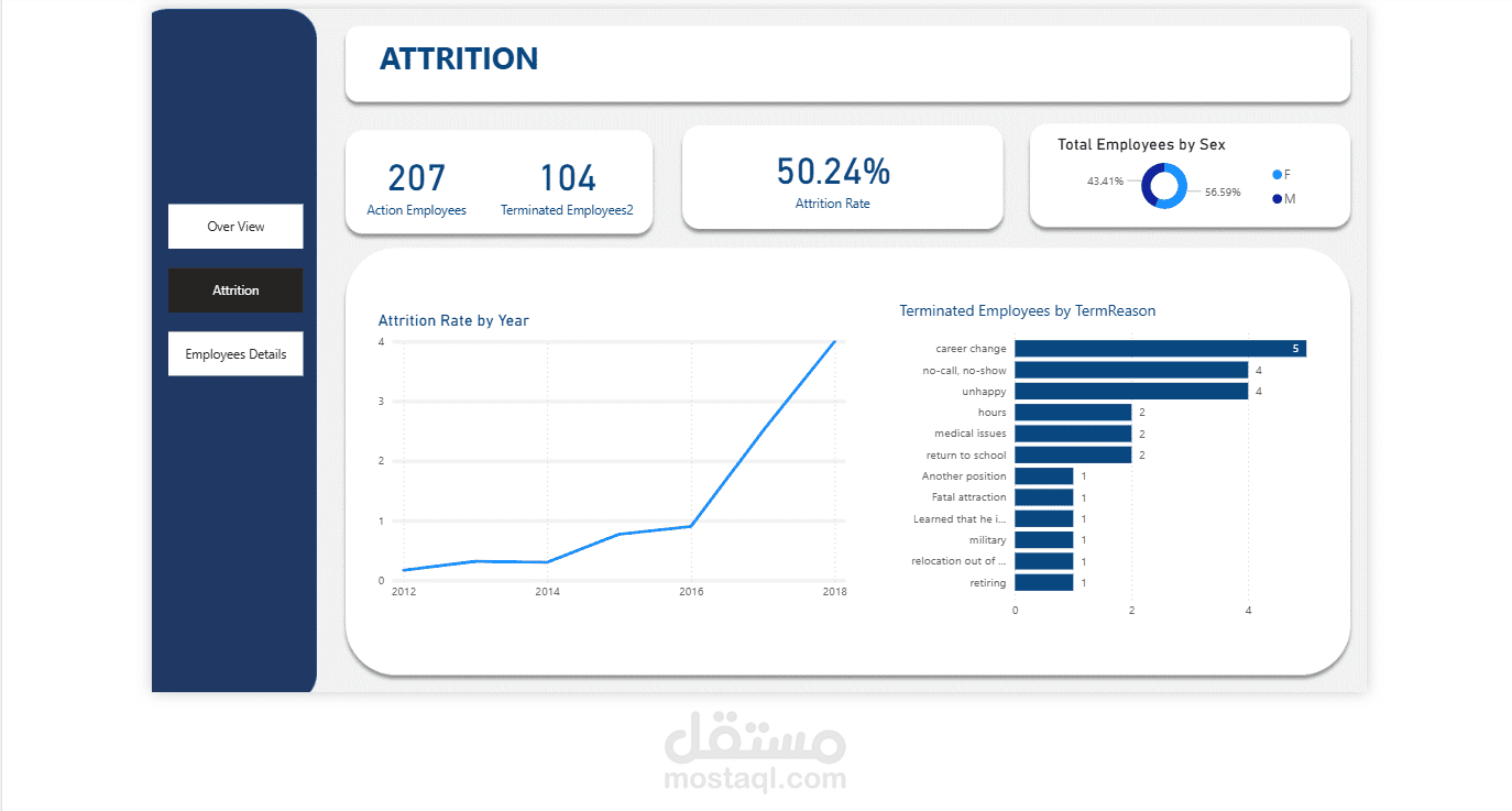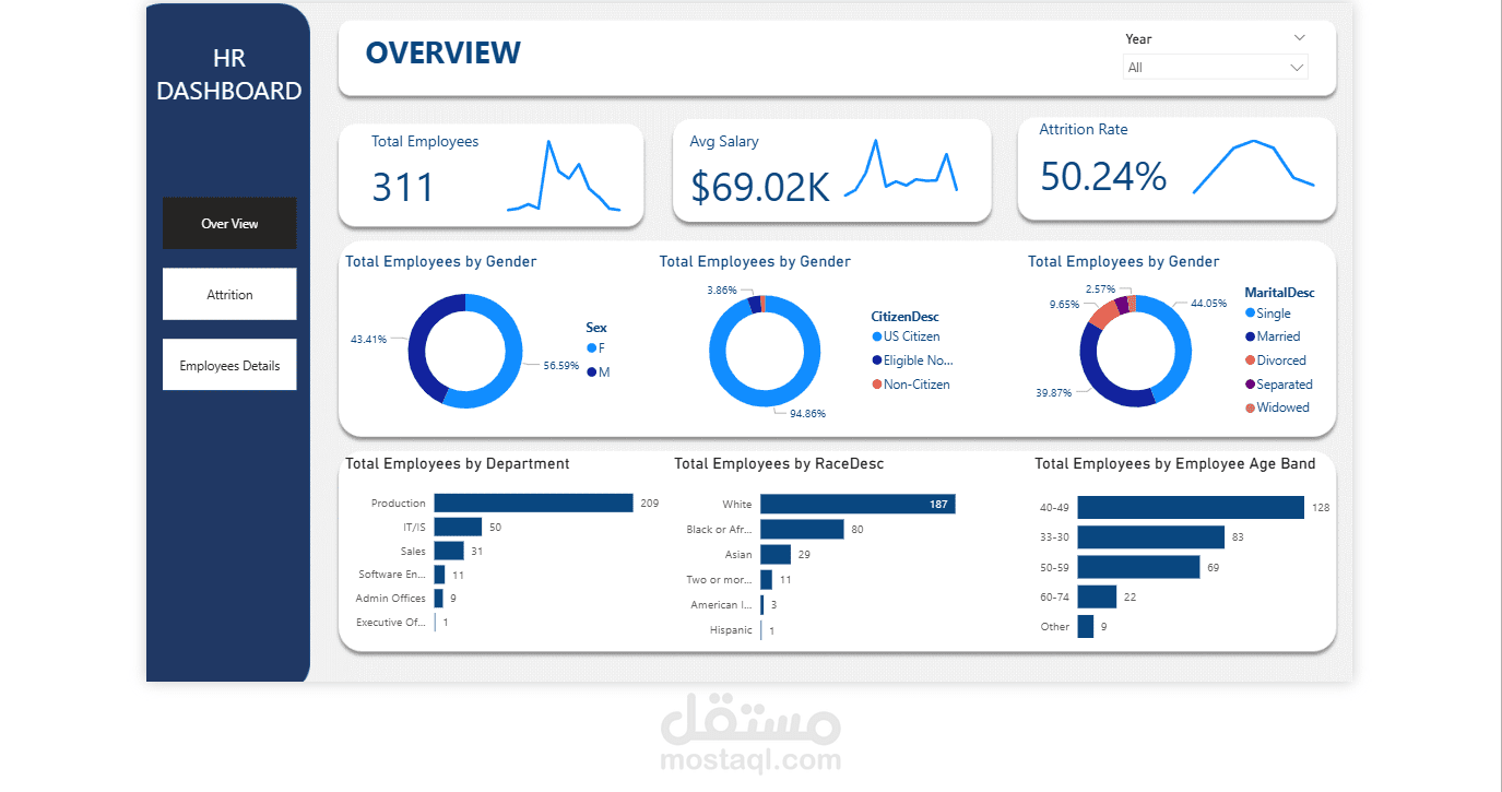 قمت بتطوير لوحة معلومات (Dashboard) تفاعلية خاصة بالموارد البشرية باستخدام Power BI، تحتوي على:
