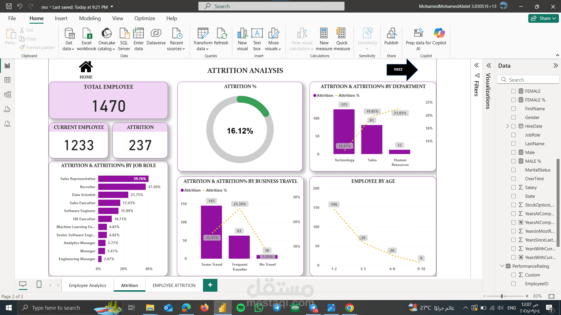 قمت بتطوير لوحة معلومات HR Dashboard تفاعلية باستخدام Power BI لعرض وتحليل بيانات الموارد البشرية.