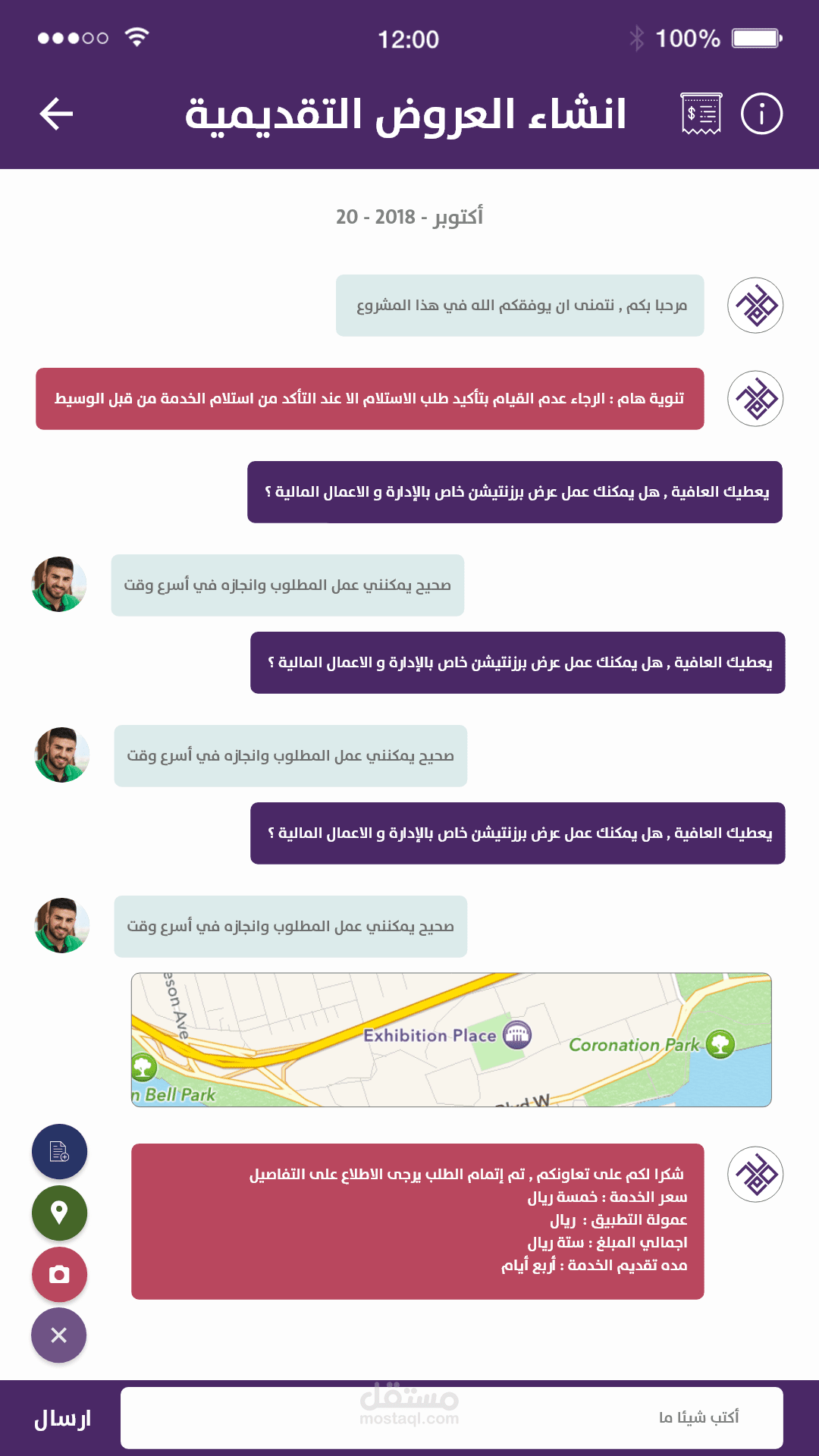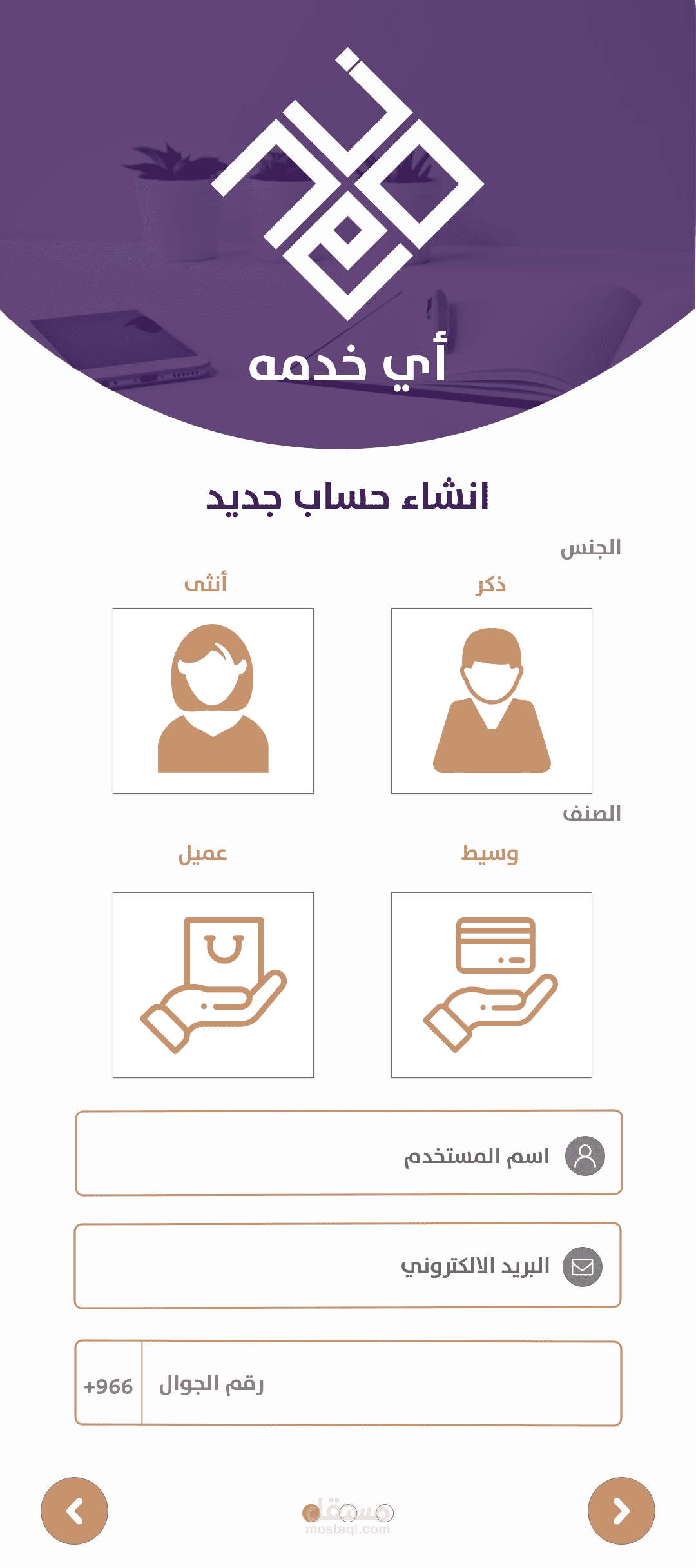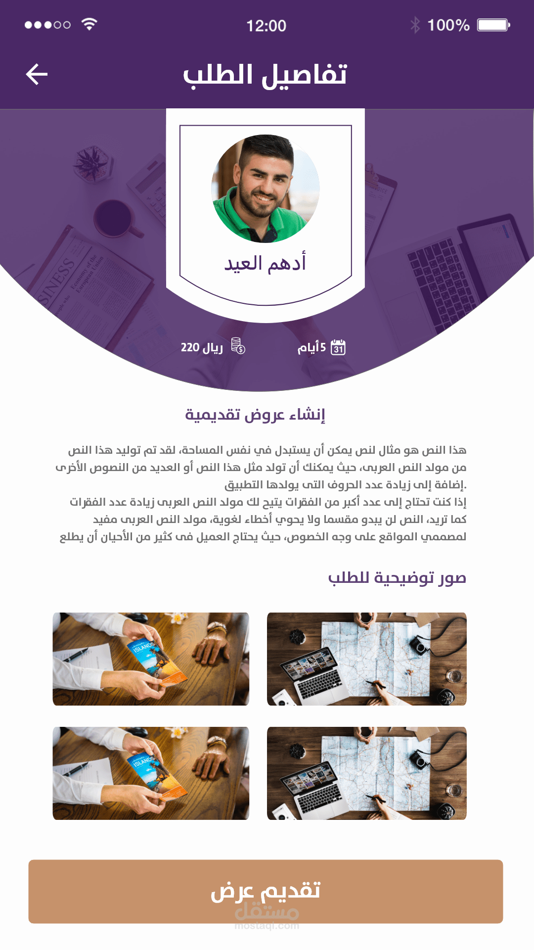 تطبيق يعتبر كحلقة وصل بين العملاء ومزودي الخدمات ، حيث يعمل التطبيق تحت عدة تصنيفات ( التسجيل في المواقع الحكومية ، التصميم ، الموشن جرافيك ، كتابة الخطابات والمعاريض والشكاوى .. إلخ ) ويقوم العميل بإنشاء طلب لأي خدمة ضمن هذه التصنيفات وببدأ بتلقي العروض من مزودي الخدمات ثم يوافق على اي عرض يراه مناسباً وتبدأ محادثة بينهما لإتمام الصفقة ثم يحصل مزود الخدمة على تقييم من قبل العميل.