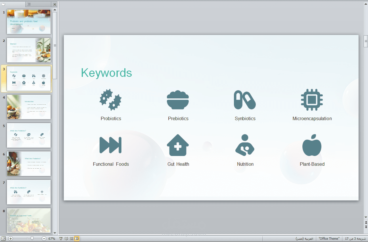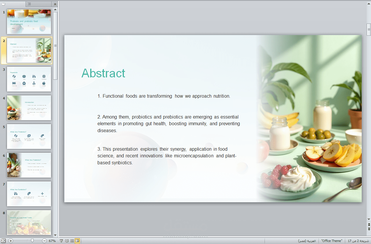 الكلمات المفتاحية (Keywords): عرض مرئي لأهم المفاهيم مثل البروبيوتيك، البريبايوتيك، السينبيوتيك، التغليف الدقيق، التغذية النباتية، وصحة الأمعاء.