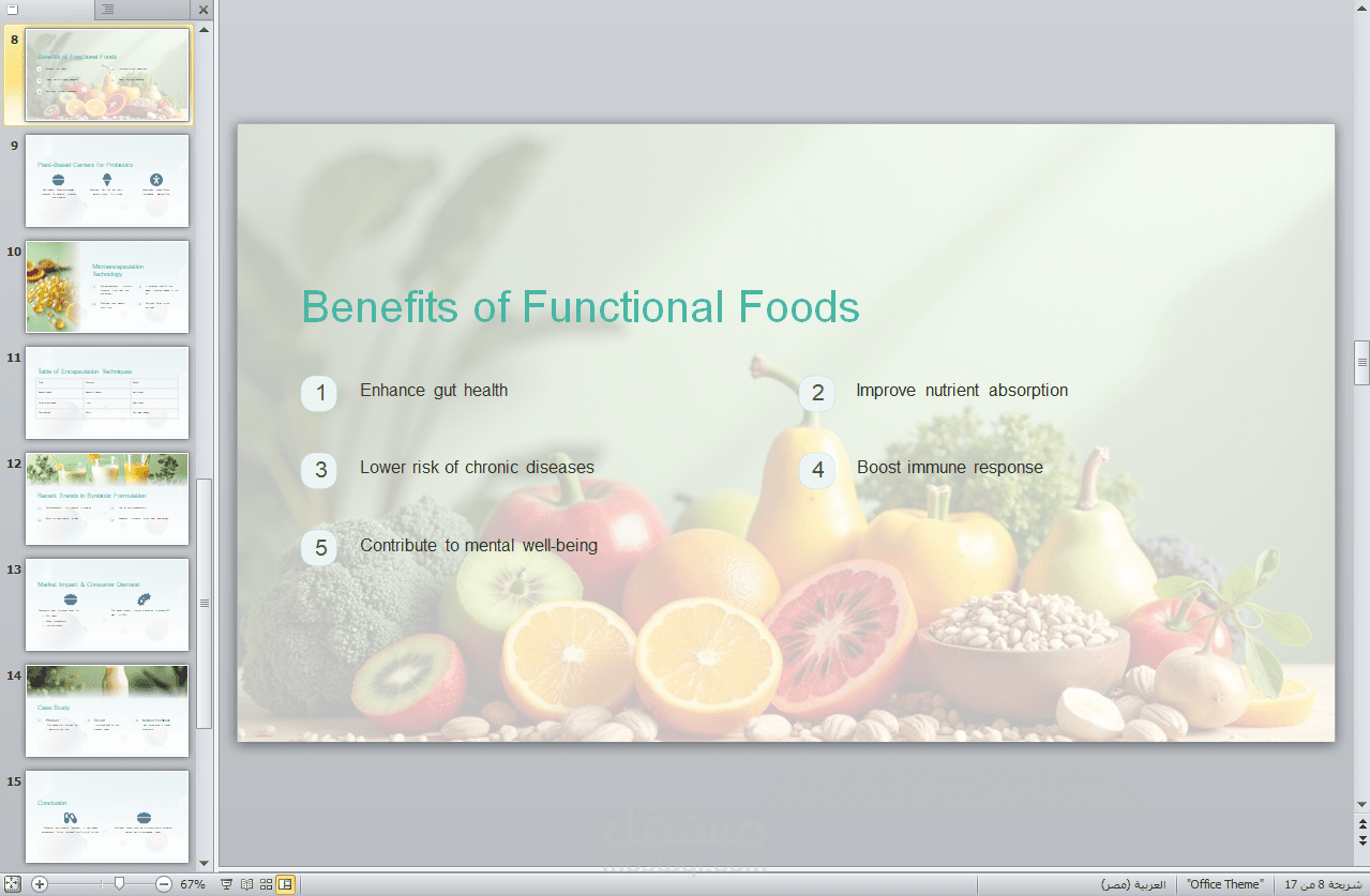 عرض تقديمي يسلط الضوء على أحدث الاتجاهات في مجال الأغذية الوظيفية، مع التركيز على البروبيوتيك والبريبايوتيك ودورهما الحيوي في تحسين صحة الجهاز الهضمي، تقوية المناعة، والوقاية من الأمراض. تم تصميم العرض بأسلوب بصري عصري يجمع بين المعلومات العلمية الدقيقة والتصميم الجذاب.