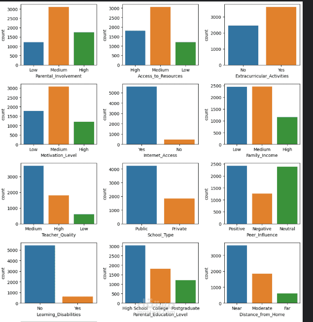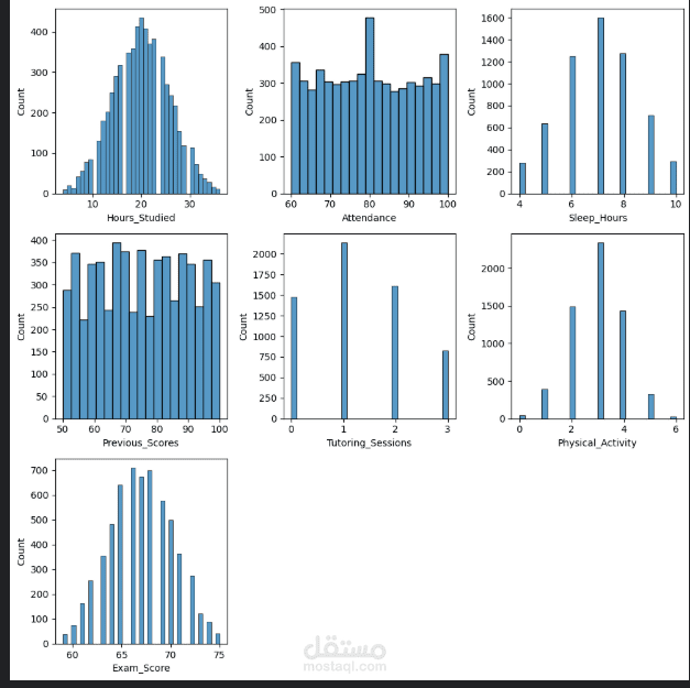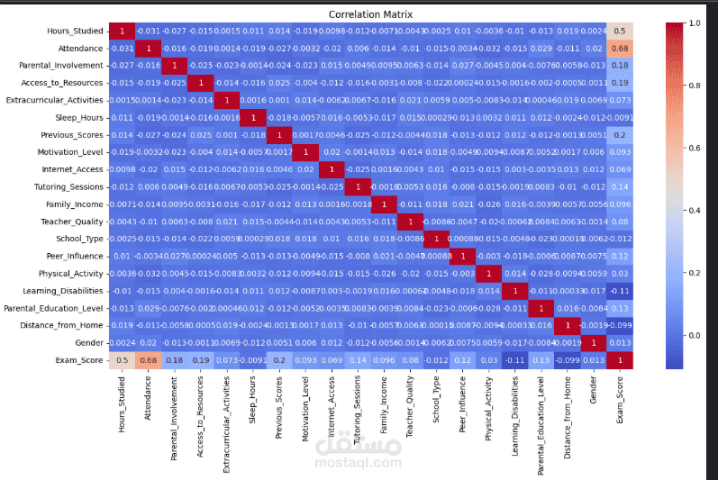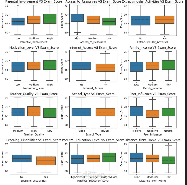 هذا المشروع يقوم بتحليل وتوقع درجات الامتحانات للطلاب بالاعتماد على العوامل الديموغرافية، الأكاديمية، والبيئية باستخدام مجموعة بيانات Student Performance Factors من Kaggle.