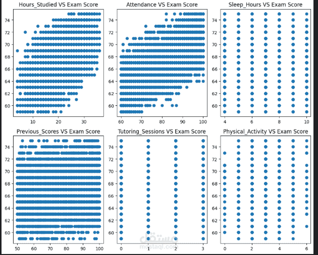 مخططات تشتت بين الخصائص ودرجة الامتحان.