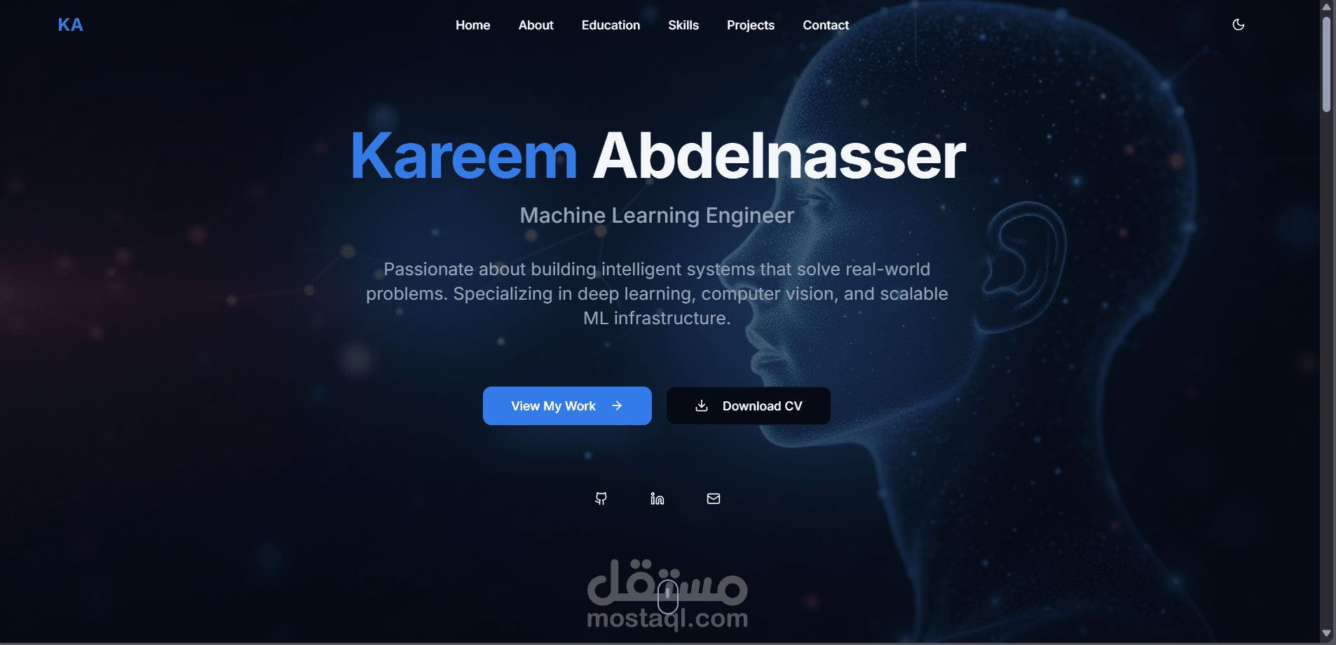 هذا هو معرض أعمالي الاحترافي كمهندس تعلم آلي، حيث أعرض من خلاله مشاريعي ومهاراتي وخبراتي في الذكاء الاصطناعي وتحليل البيانات. يتضمن الموقع نماذج عملية في التعلم الآلي والتعلم العميق وتحليل البيانات، مع تصميم متجاوب وبسيط. كما يحتوي على روابط لمستودعاتي على GitHub ومعلومات للتواصل، مما يسهل على أصحاب العمل أو المتعاونين المحتملين التواصل معي.