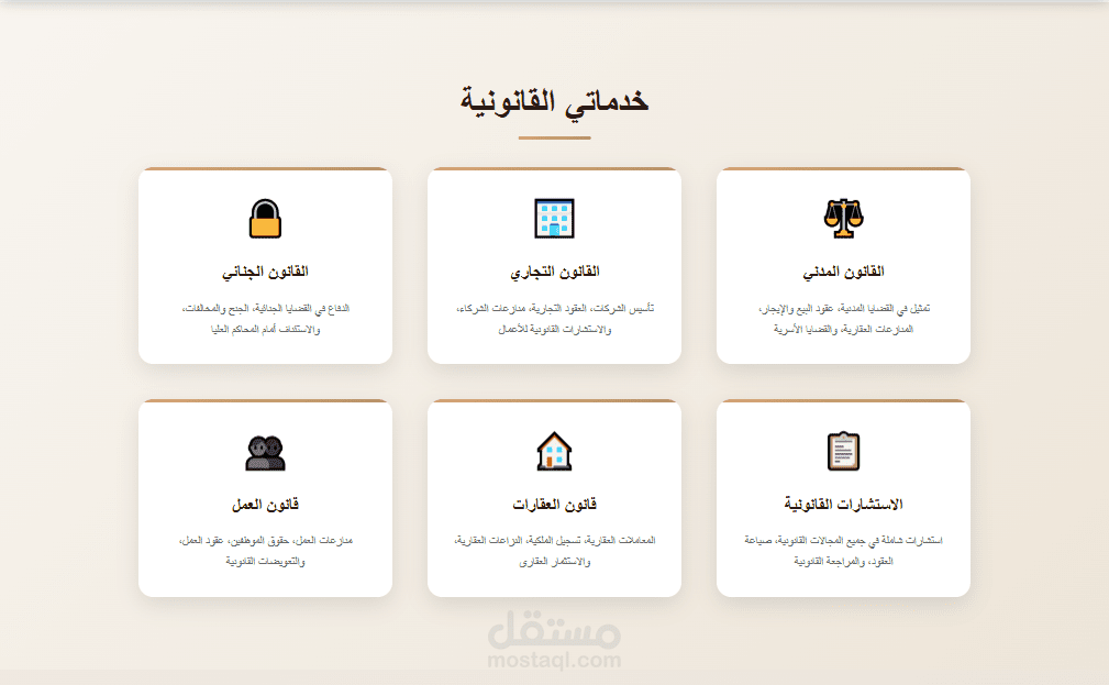 ️ الخدمات → عرض جميع الخدمات القانونية بشكل مرتب وواضح.