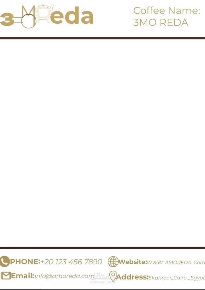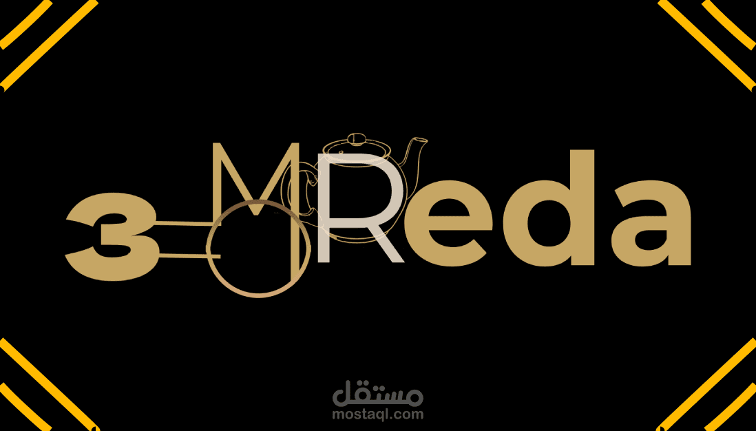 تصميم شعار عمو رضا لكافيه شوب عائلي بالوان ذهبي غامق وفاتح يوحي بالرقي والوضوح مع دمج حروف الكلمه علي شكل عناصر