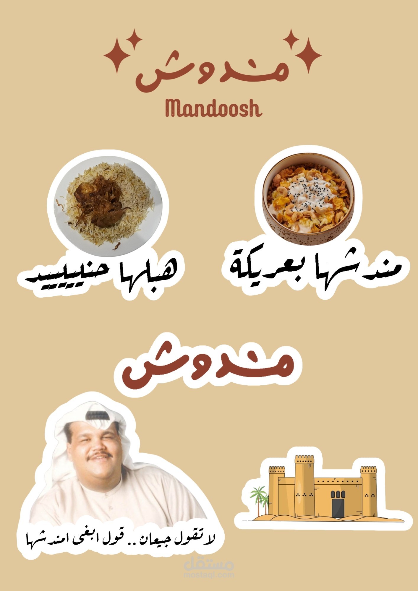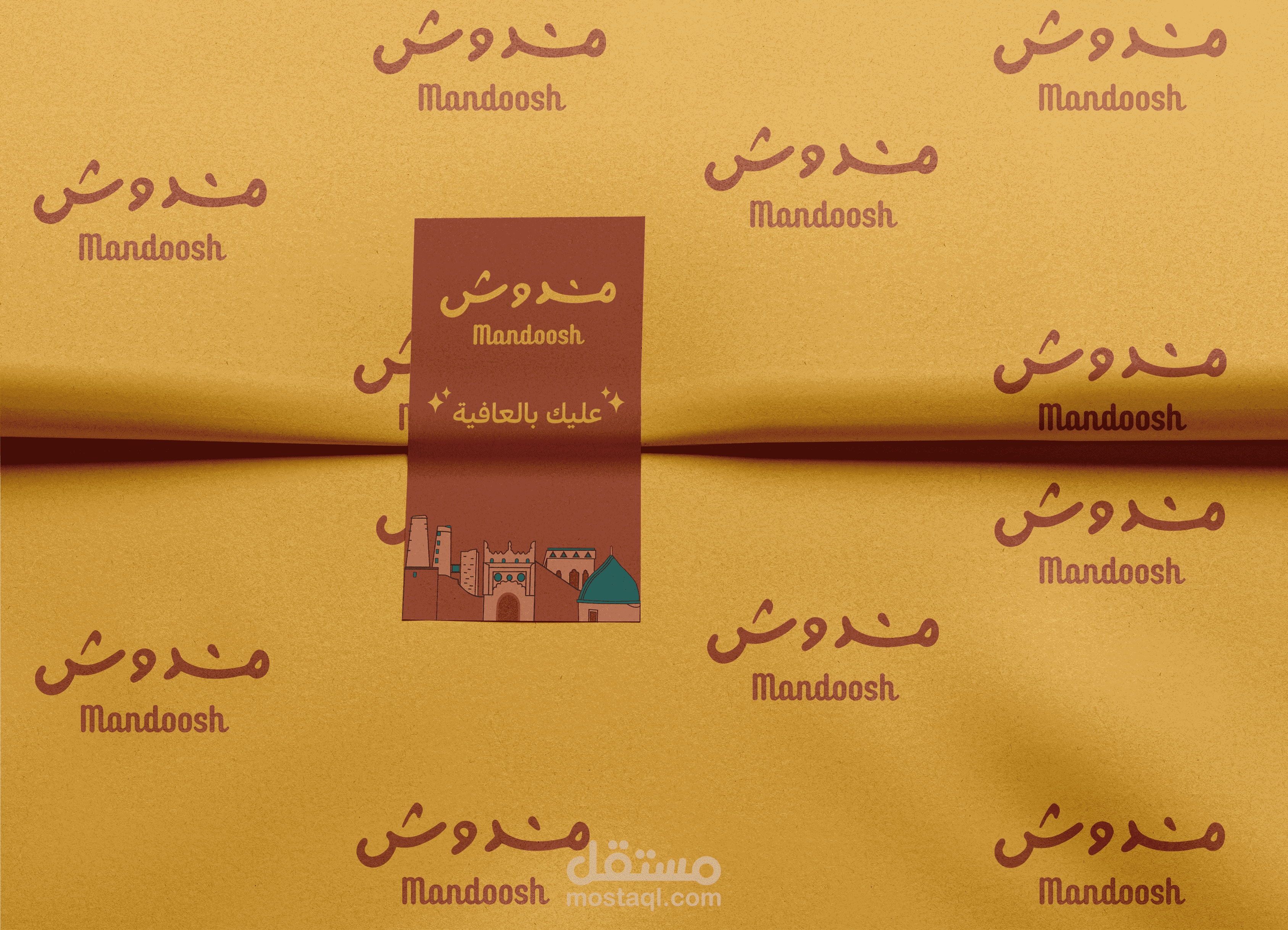 تصميم باكيجينج يعكس الهوية الشعبية الأصيلة بروح عصرية مبتكرة، يجمع بين البساطة والجرأة ليعبّر عن تجربة "مندوش" المليئة بالنكهات الثقيلة والكرم الجيزاني الأصيل. يعتمد التصميم على ألوان دافئة مستوحاة من أجواء المندي والحطب (مثل البرتقالي، البيج، ولمسات الفحمية)، مع نقوش ورسوم شعبية مستوحاة من التراث الجنوبي بطريقة حديثة.