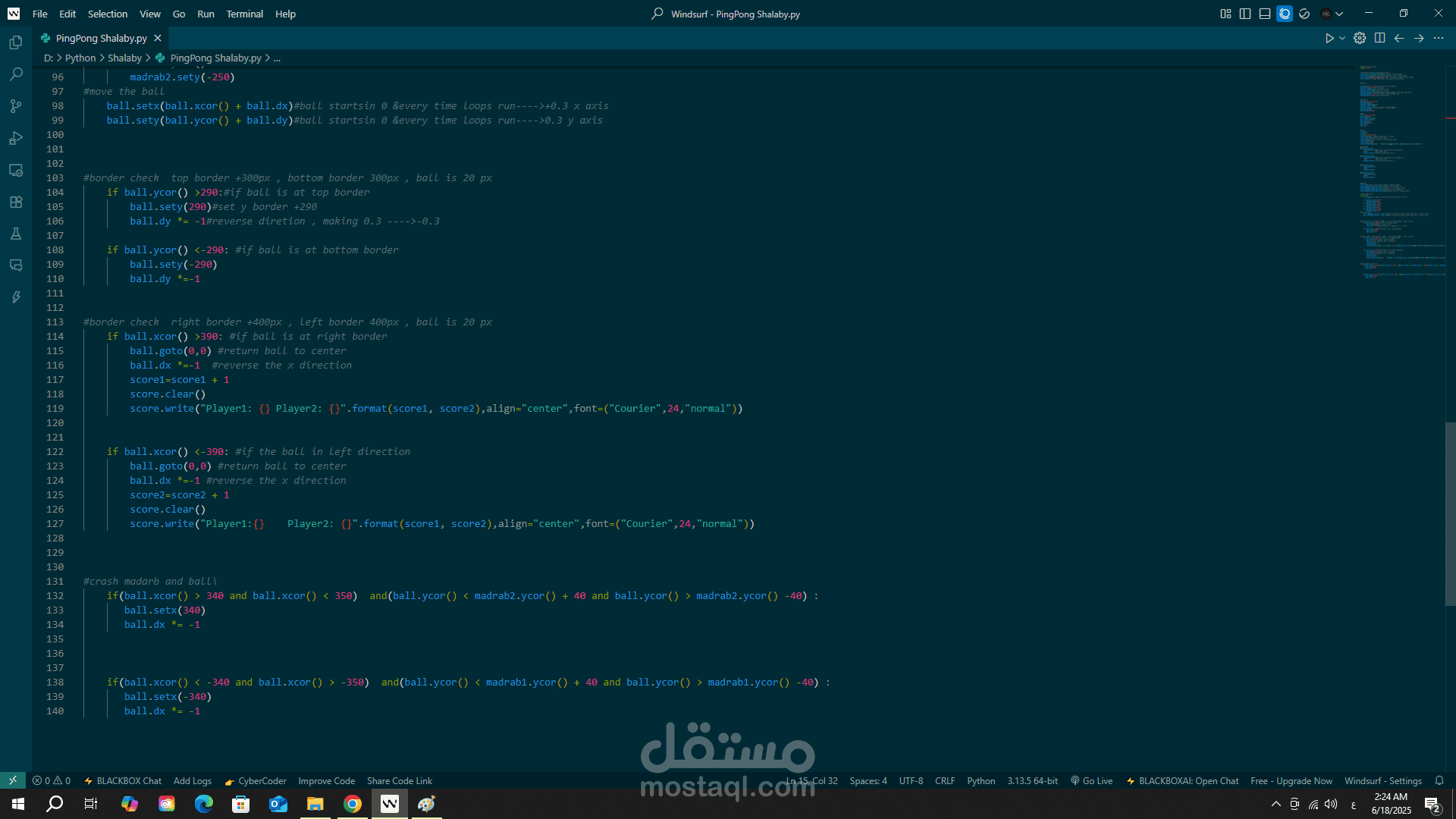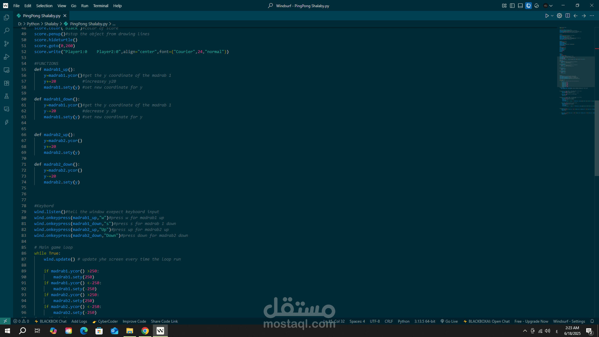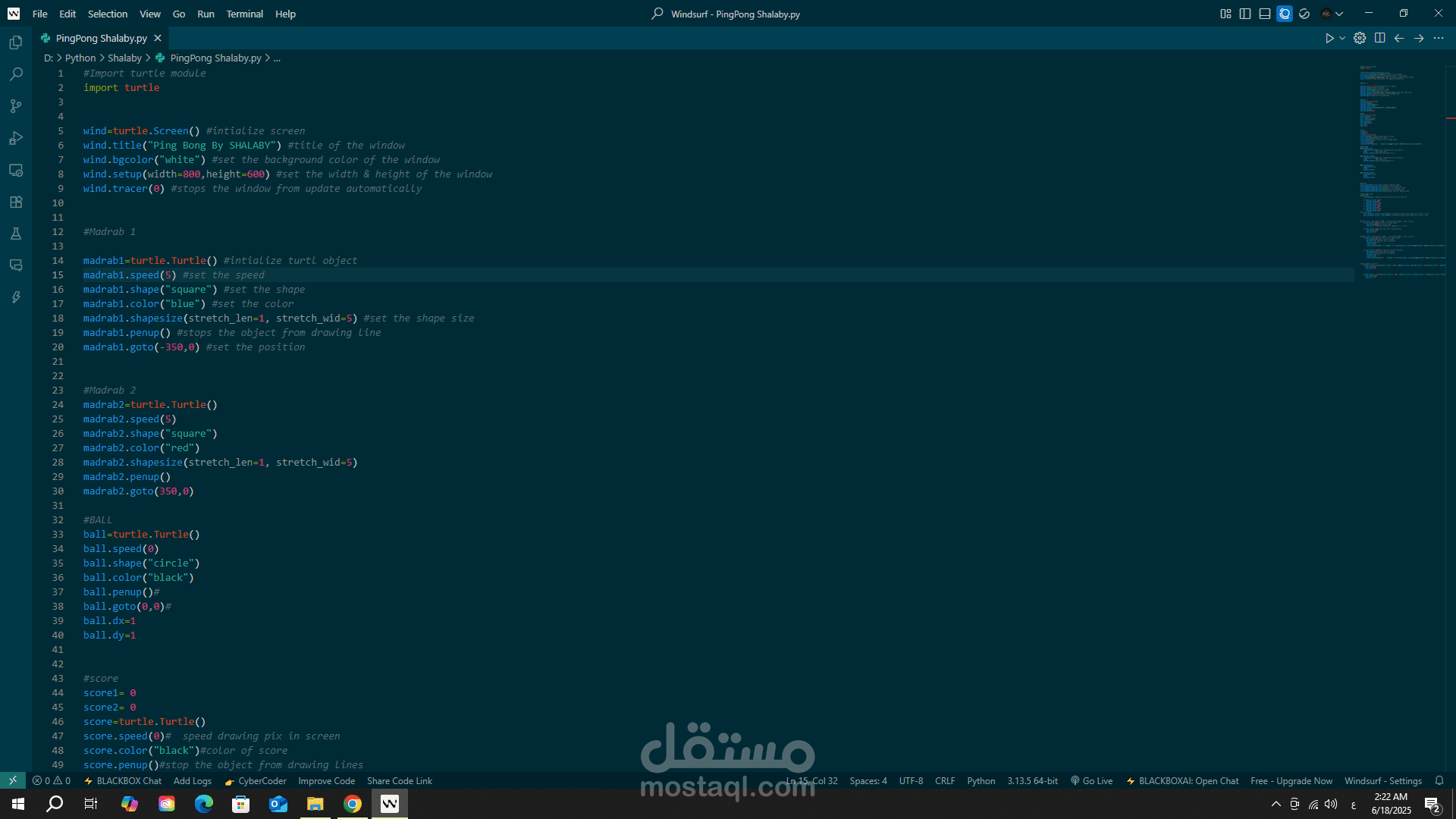 لعبة تنس طاولة بسيطة باستخدام سلحفاة بايثون. يتحكم لاعبان بمضربين لضرب الكرة. تزداد النتيجة عندما يخطئ الخصم. ممتعة، تفاعلية، وسهلة التخصيص!