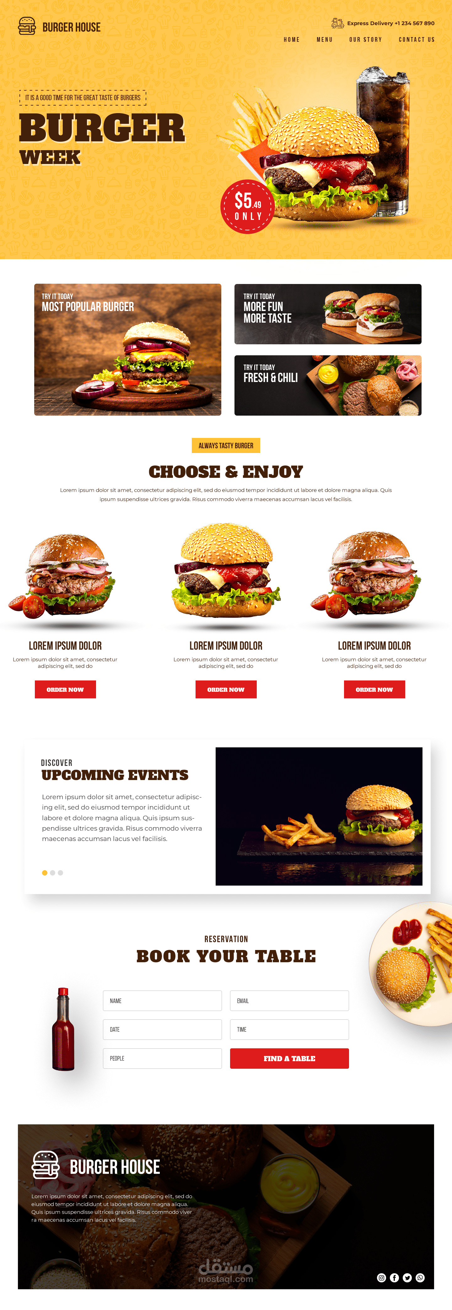 صممت صفحة ويب كاملة وتفاعلية لمطعم برجر باسم "BURGER HOUSE". الهدف من التصميم هو جذب العملاء وتعزيز تجربة المستخدم من خلال عرض المنتجات والعروض بشكل visual وجذاب.