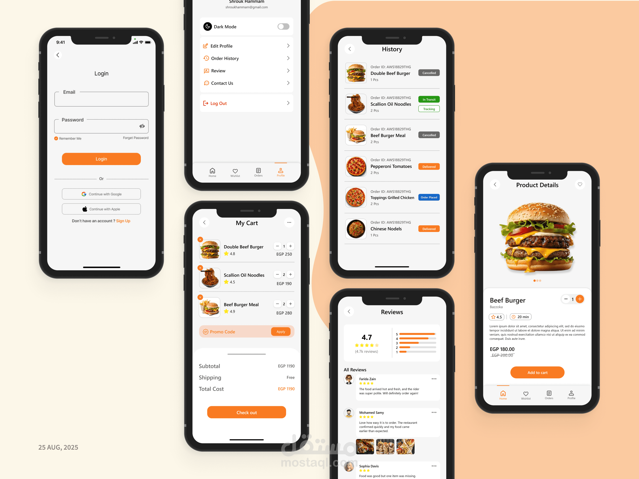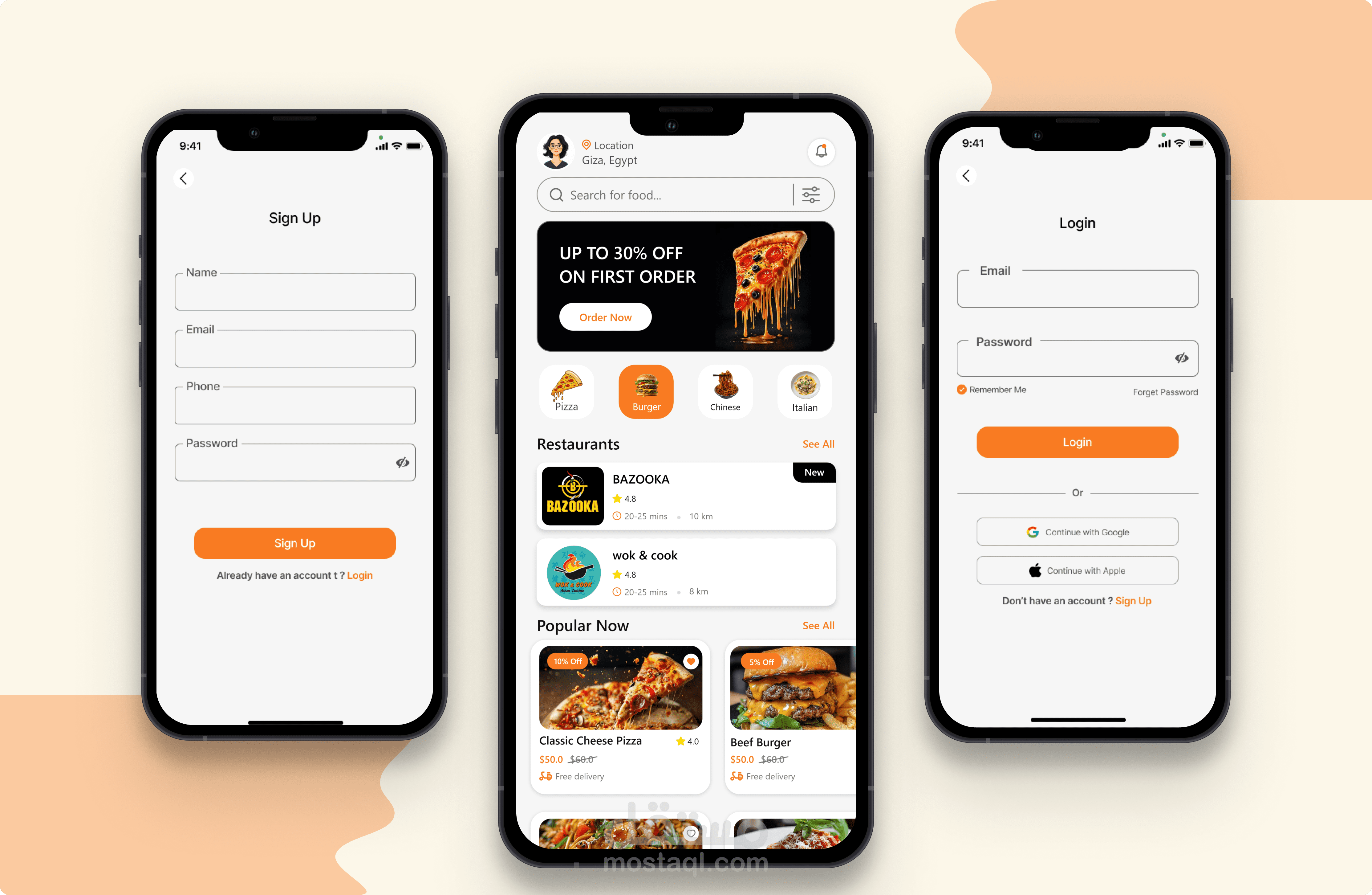 تصميم تطبيق Food Delivery لتوصيل الطلبات، يهدف لتقديم تجربة سهلة وسريعة للمستخدمين مع واجهة عصرية وجذابة.