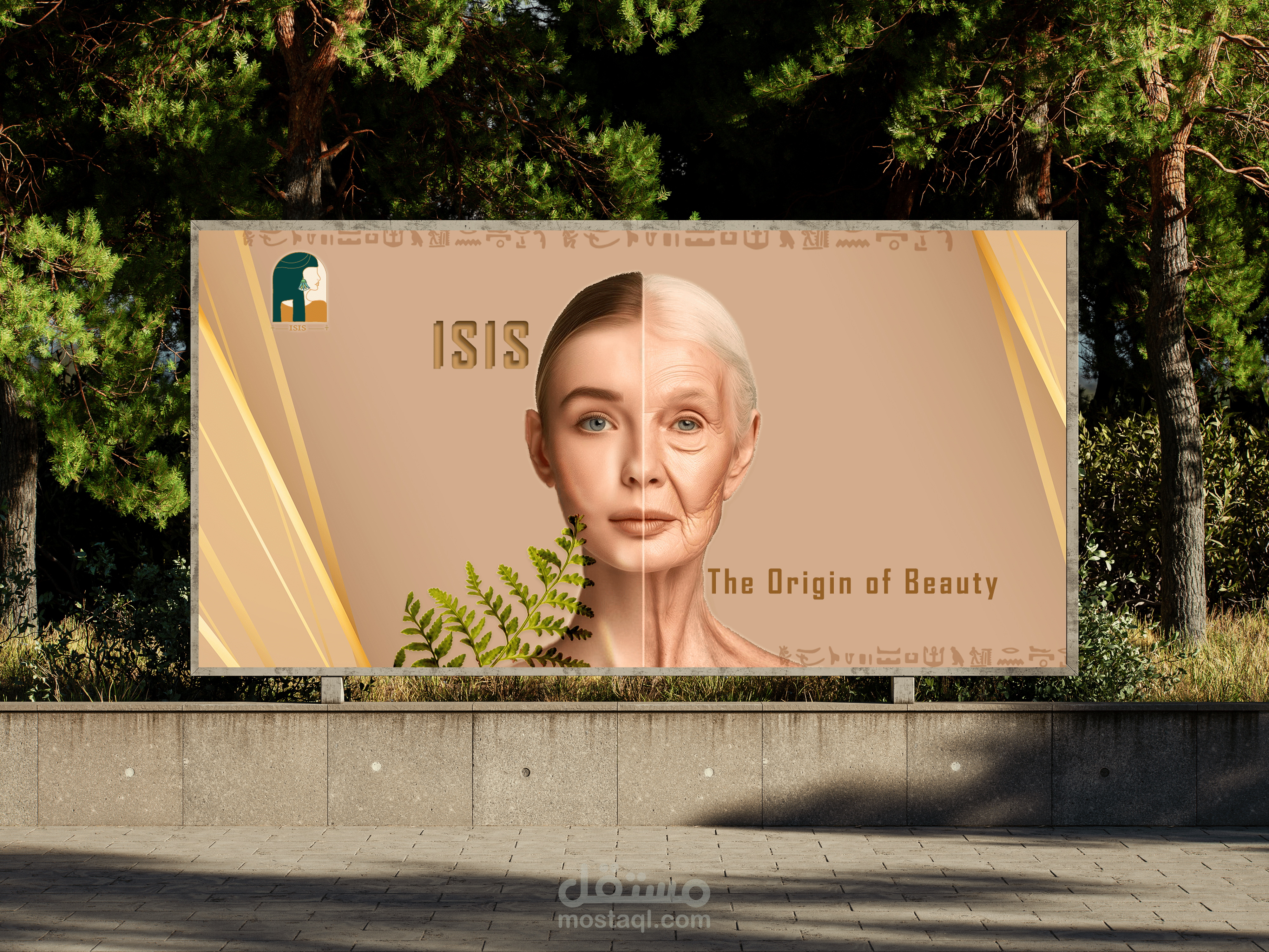 "Isis is a luxury cosmetics brand inspired by the timeless elegance of Ancient Egypt. The brand identity is rooted in the belief that beauty originates from history, with the goddess Isis symbolizing femininity, strength, and rebirth. Through a refined palette of gold, black, and off-white, the visual identity communicates sophistication and exclusivity. The logo combines iconic Egyptian symbols – Isis, the lotus flower, and the ankh – to create a unique and memorable mark. This project showcases the full brand identity system, including logo design, color palette, typography, packaging, business cards, billboards, and social media posts.