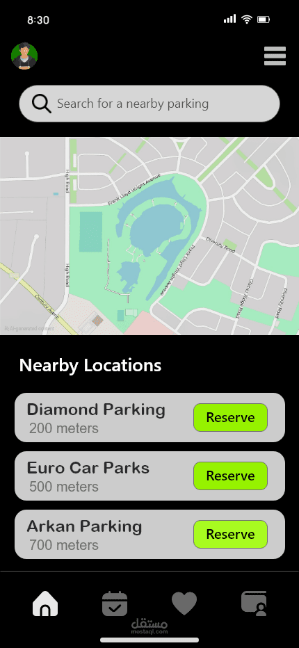 ركّزت في التصميم على البساطة وسهولة التنقل بين الشاشات، مع إبراز الخرائط وقوائم المواقف بشكل واضح ليتمكن المستخدم من إدارة عملية الحجز مباشرة من هاتفه.