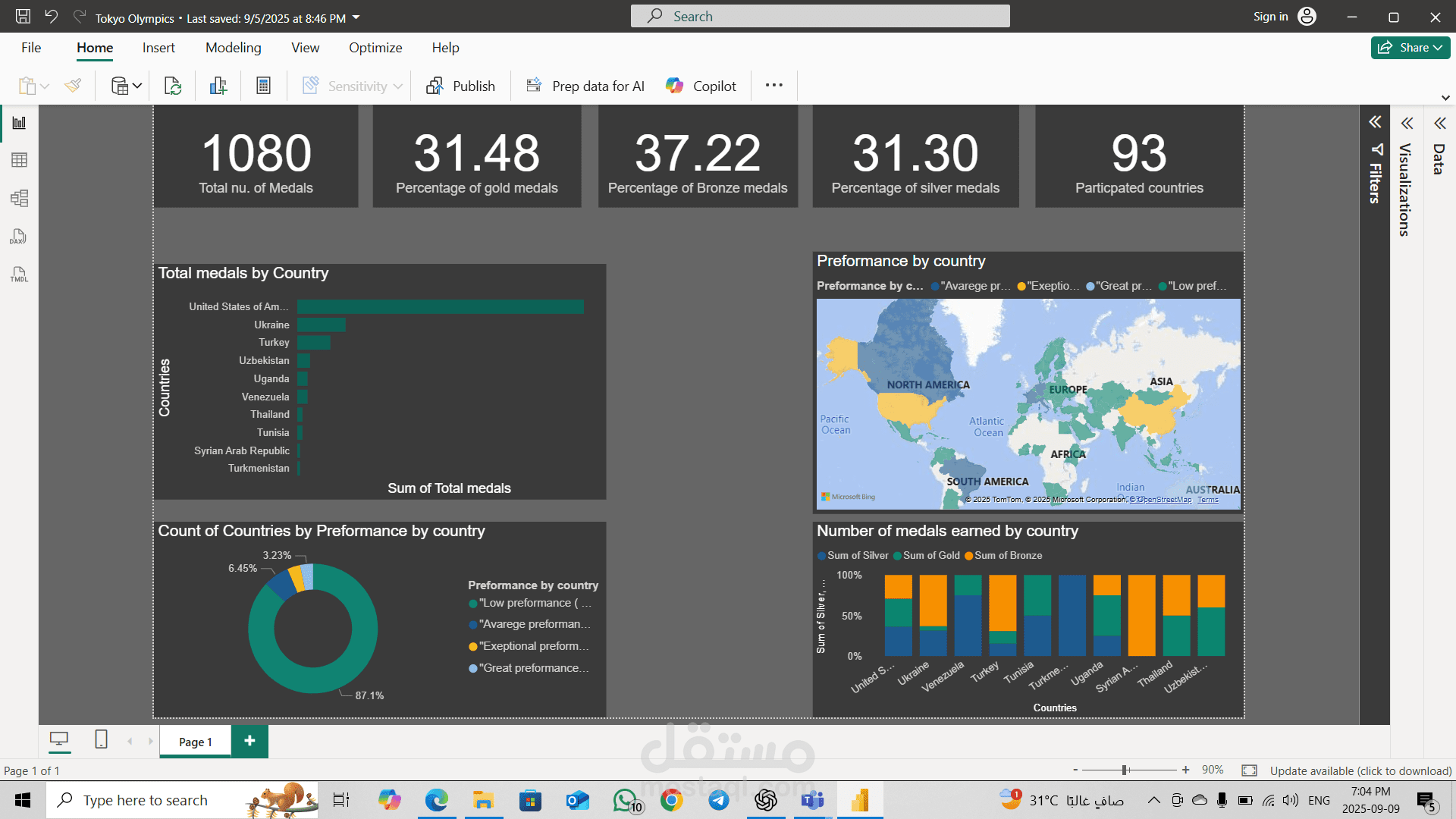 كما يوضح الرسم البياني الخاص بتوزيع الميداليات نوع الميداليات التي حصلت عليها كل دولة، مما يتيح مقارنة مباشرة بين الذهب والفضة والبرونز لكل منها.