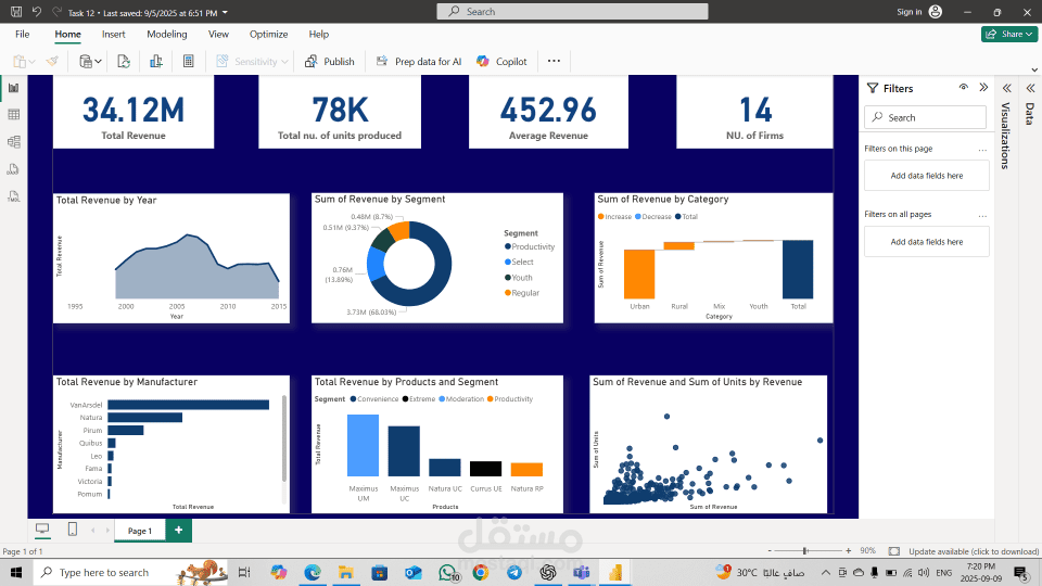 بالنسبة للمصنّعين، حققت شركة **VanArsdel** أعلى الإيرادات مقارنة بباقي الشركات مثل Natura وPirum وQuibus، بينما جاءت شركات أخرى مثل Leo وFama وVictoria وPomum بإيرادات أقل بكثير.