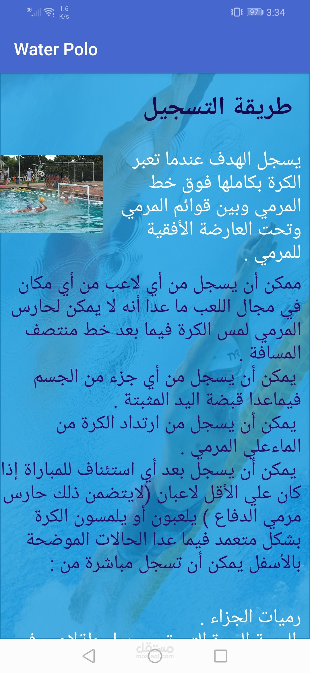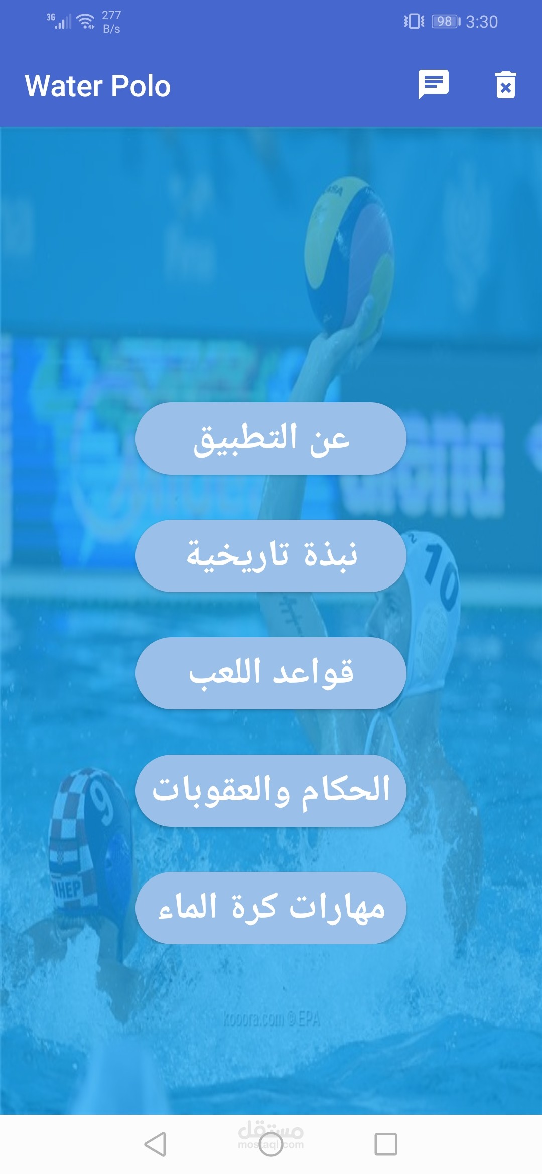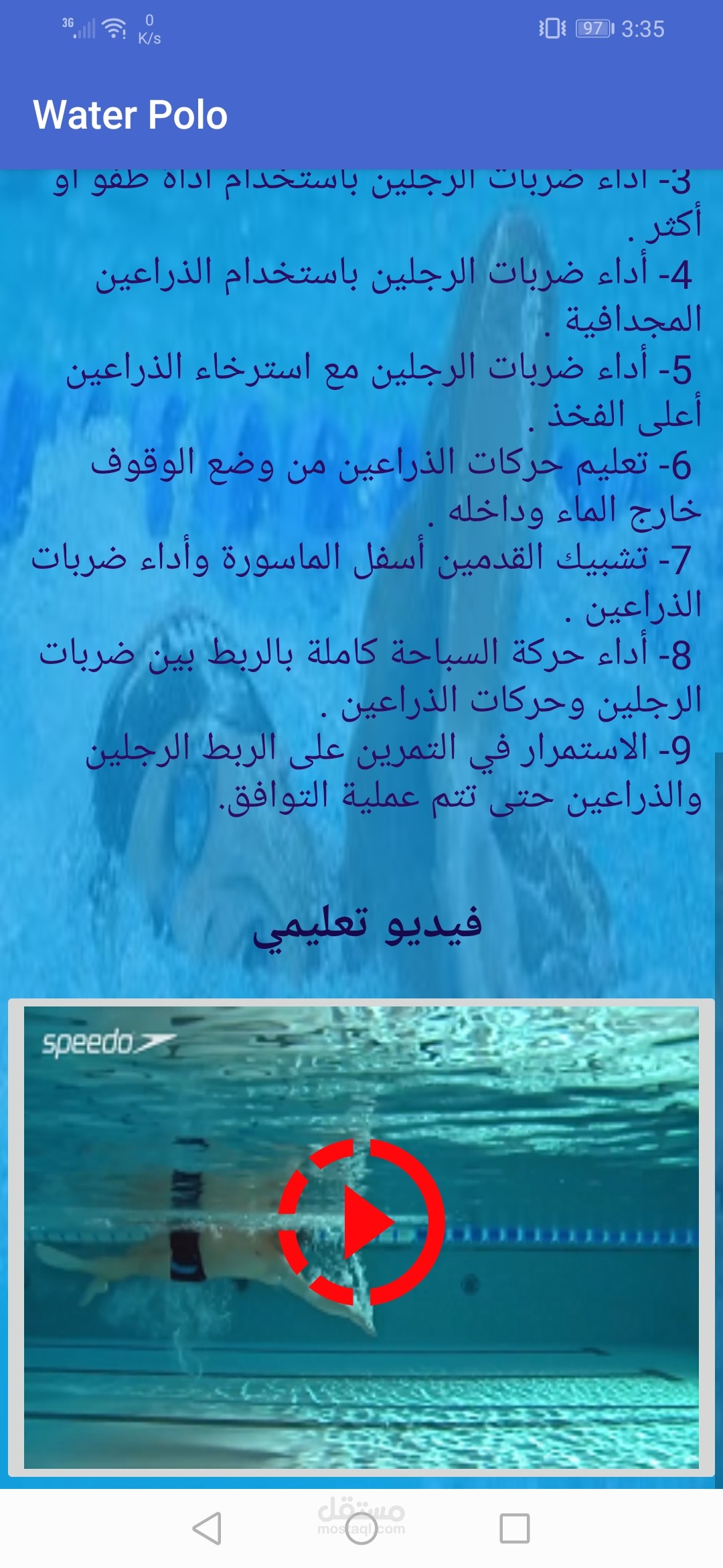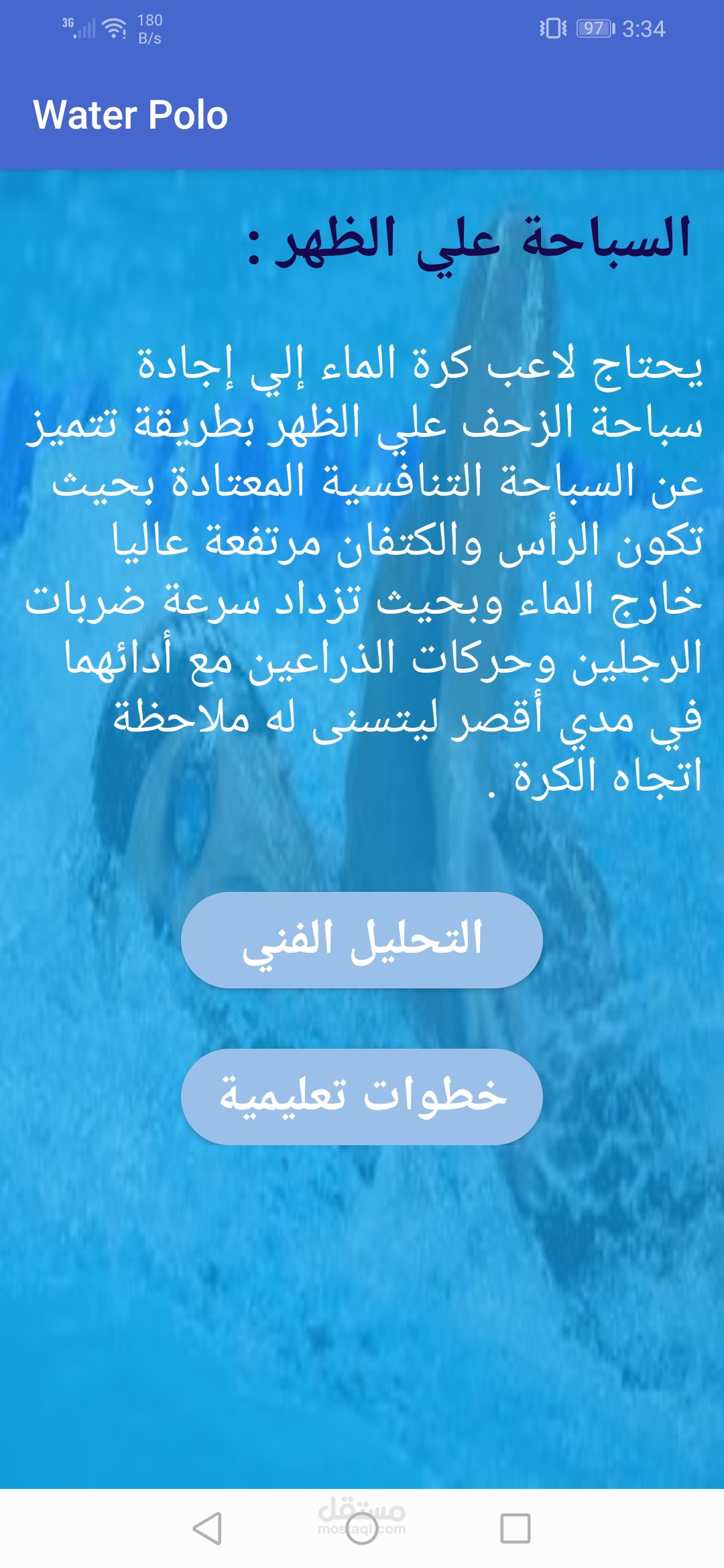 تطبيق اندرويد متخصص في تعليم الشباب رياضه كره الماء كما يوجد به دردشه خاصه بين المتدربين والمدرب
