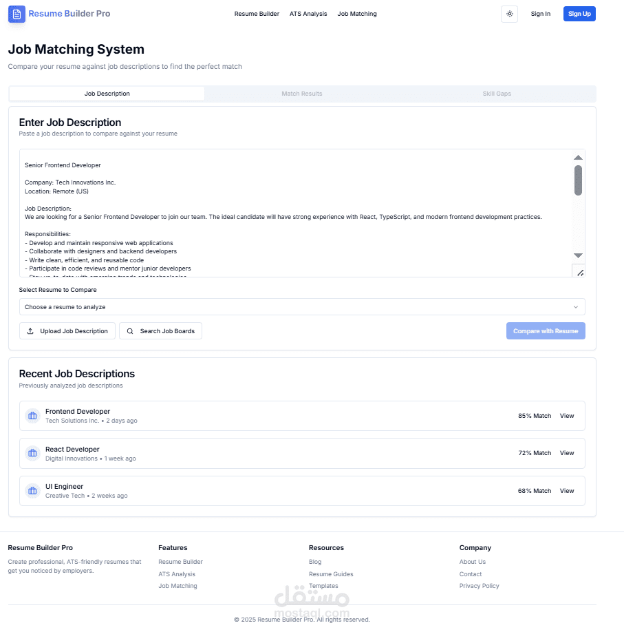 وأخيرًا، يقدم النظام ميزة Job Matching التي تقوم بمطابقة مهارات وخبرات المستخدم مع الوظائف المتاحة واقتراح الفرص الأكثر ملاءمة له.