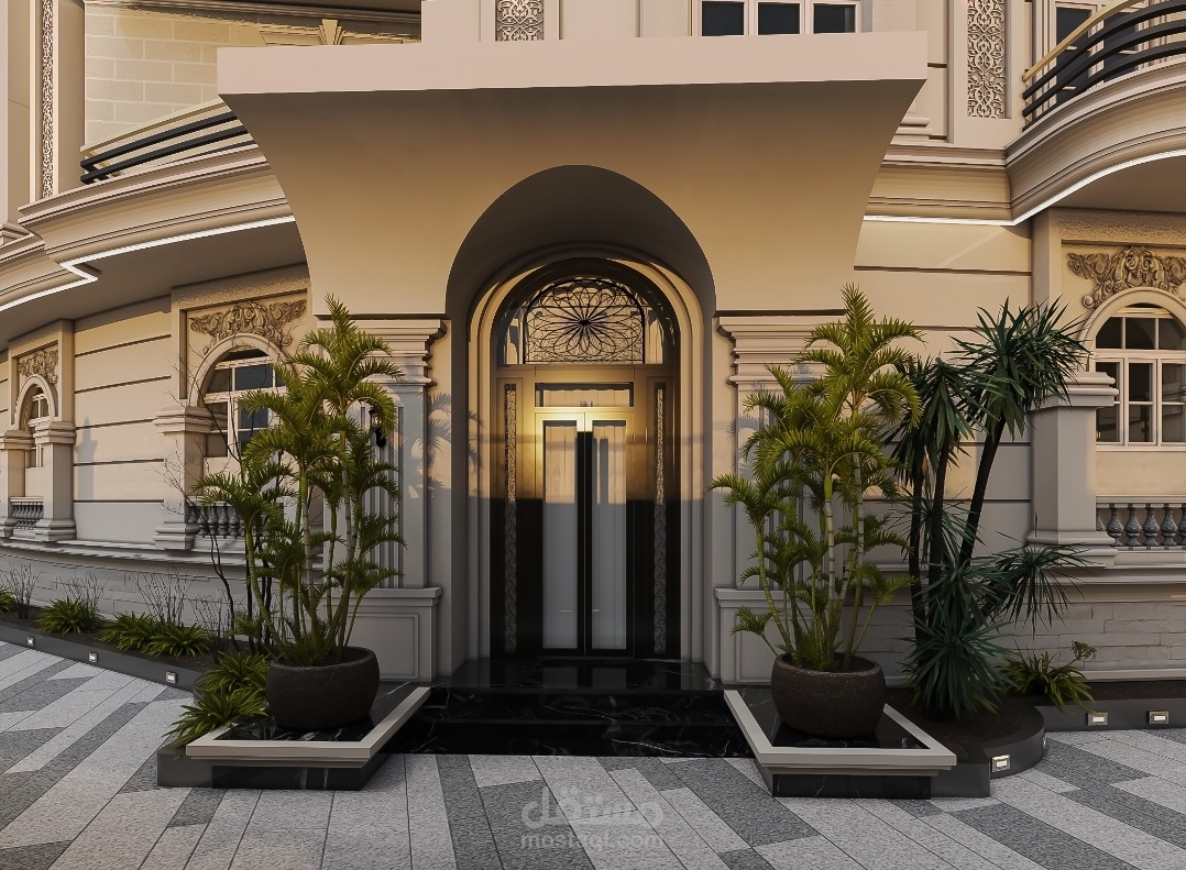 تم تصميم والواجهه الكلاسيك بالاهتمام بالتفاصيل الدقيقة واستخدام عناصر جماليه لتُثري من جمالها دون مبالغة البرامج المستخدمة : 3d max& v ray& photoshop