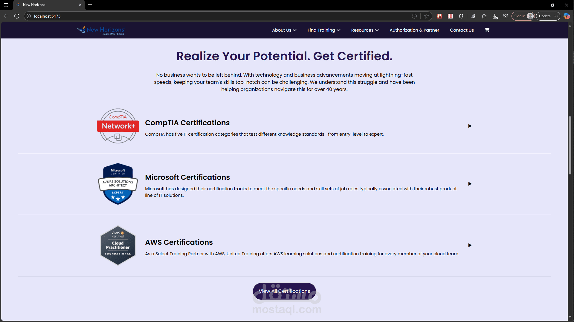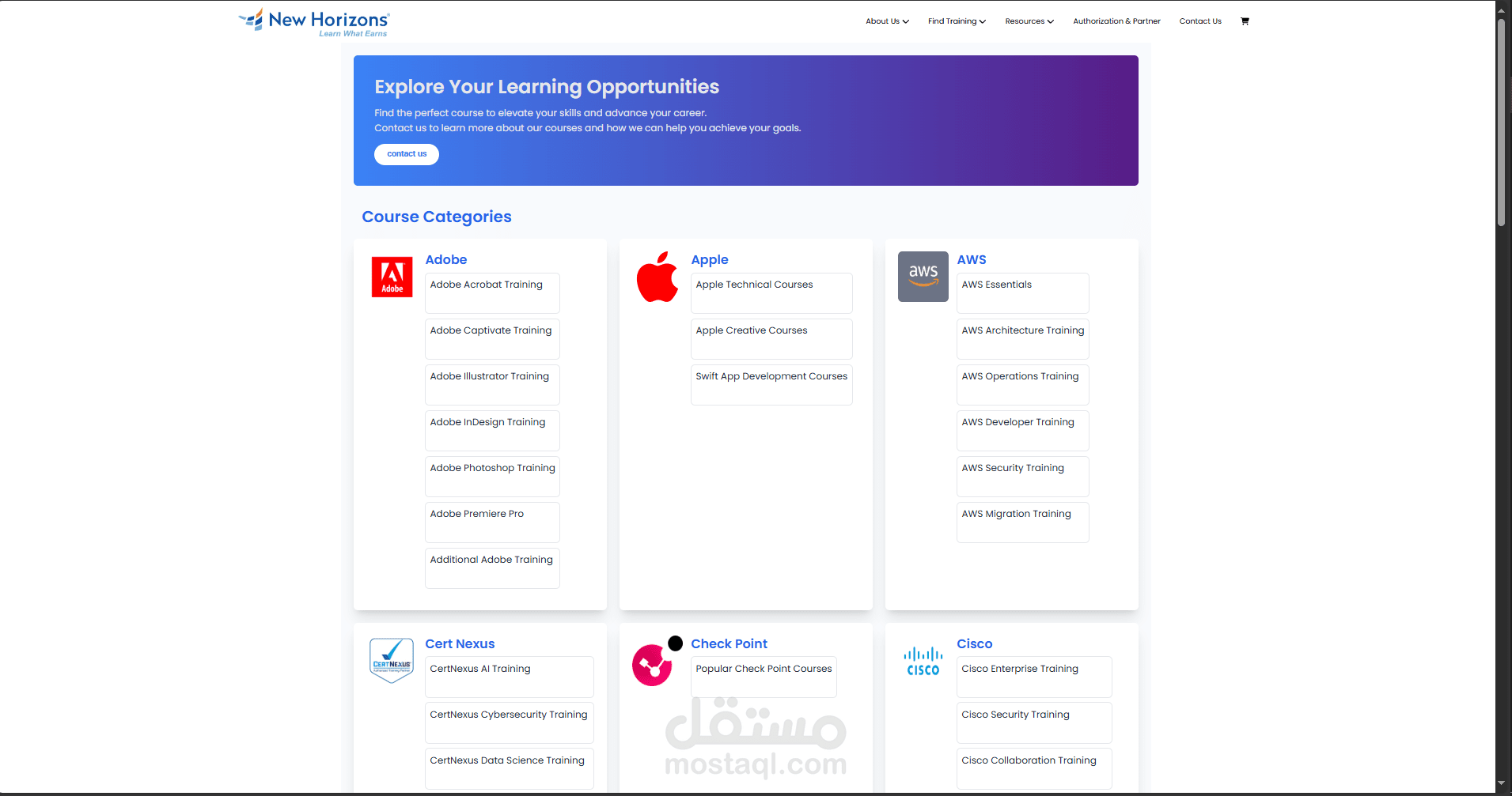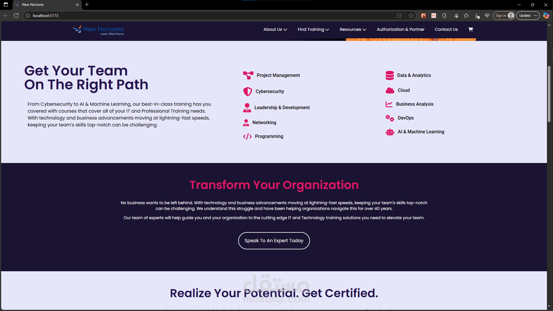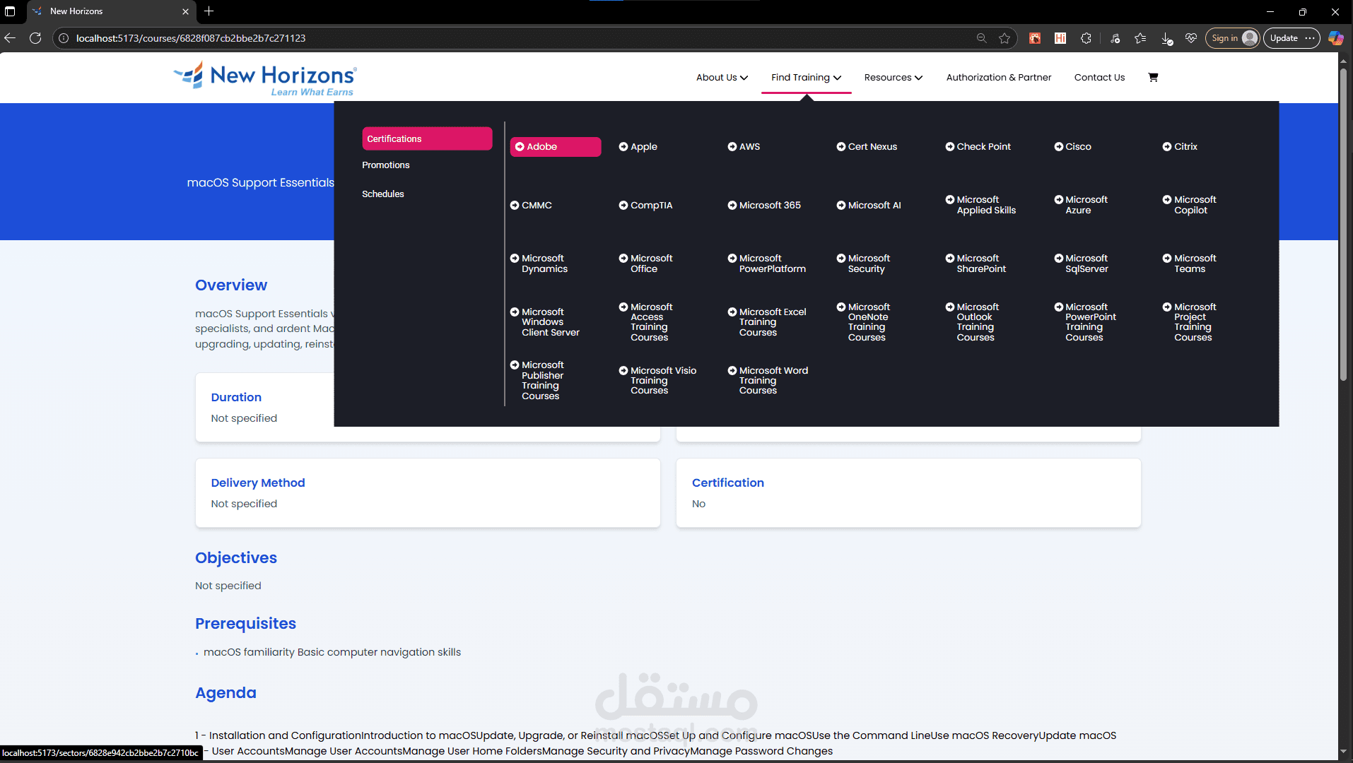 الصفحات الخاصة بالدورات، الشهادات، العروض، التدريب، الجداول الزمنية، والموارد (مثل: الويبينار، طرق التعلم، التوظيف، التحقق من الشهادات، المدونة).