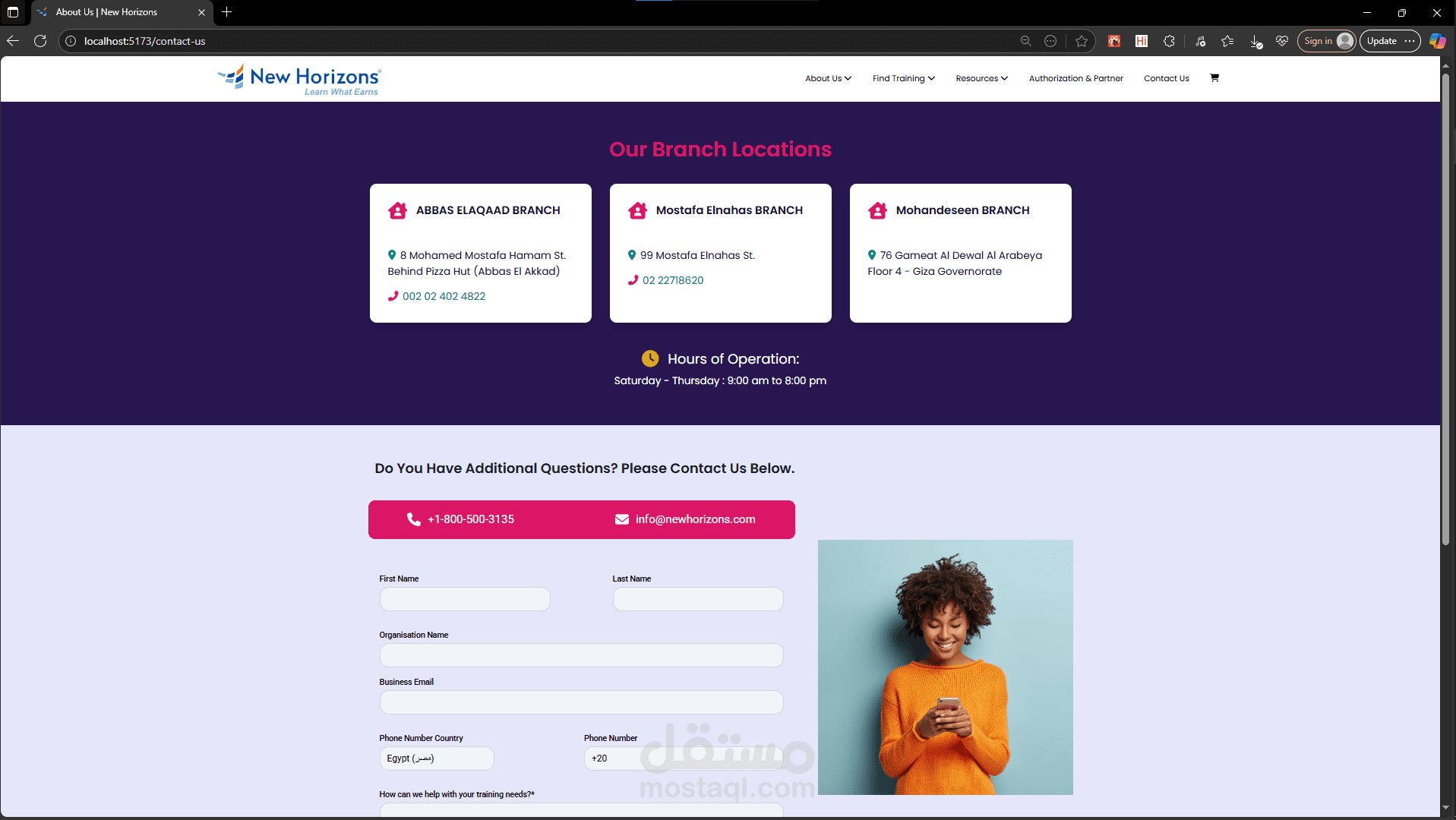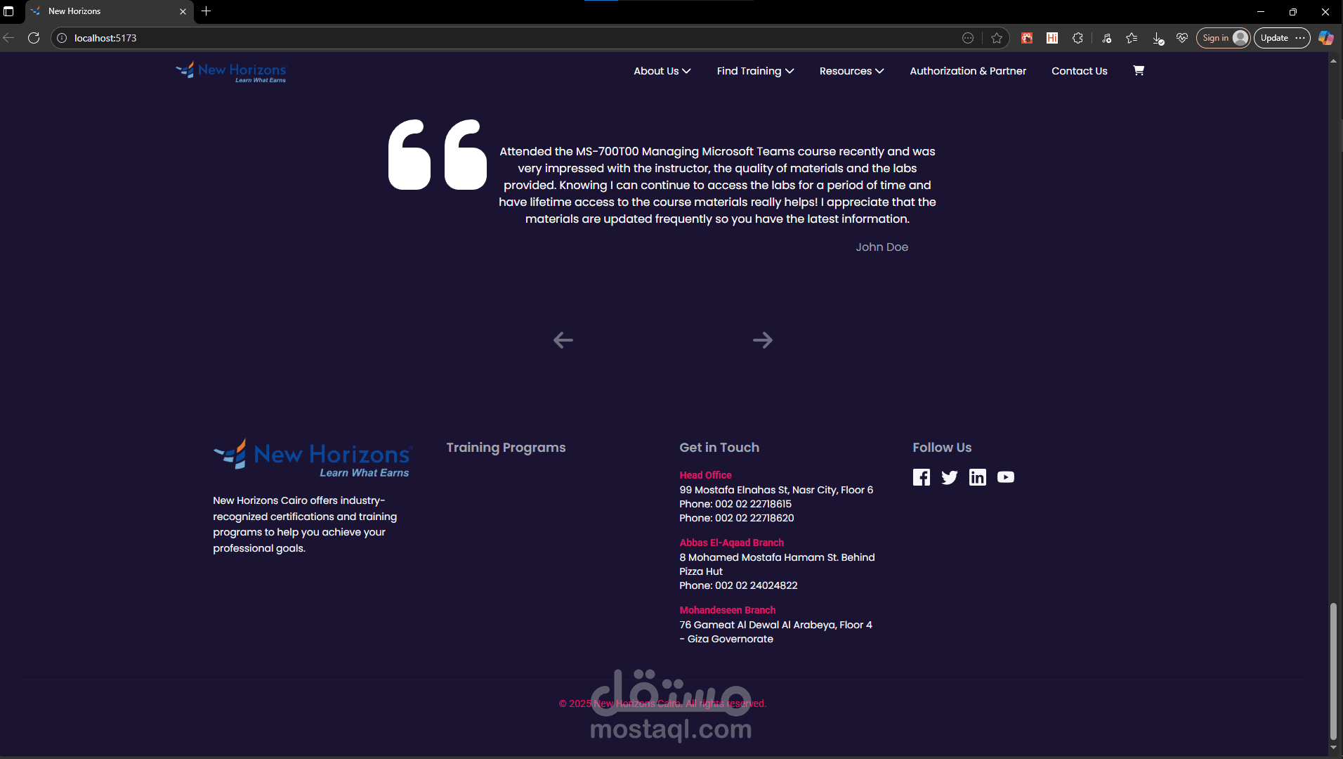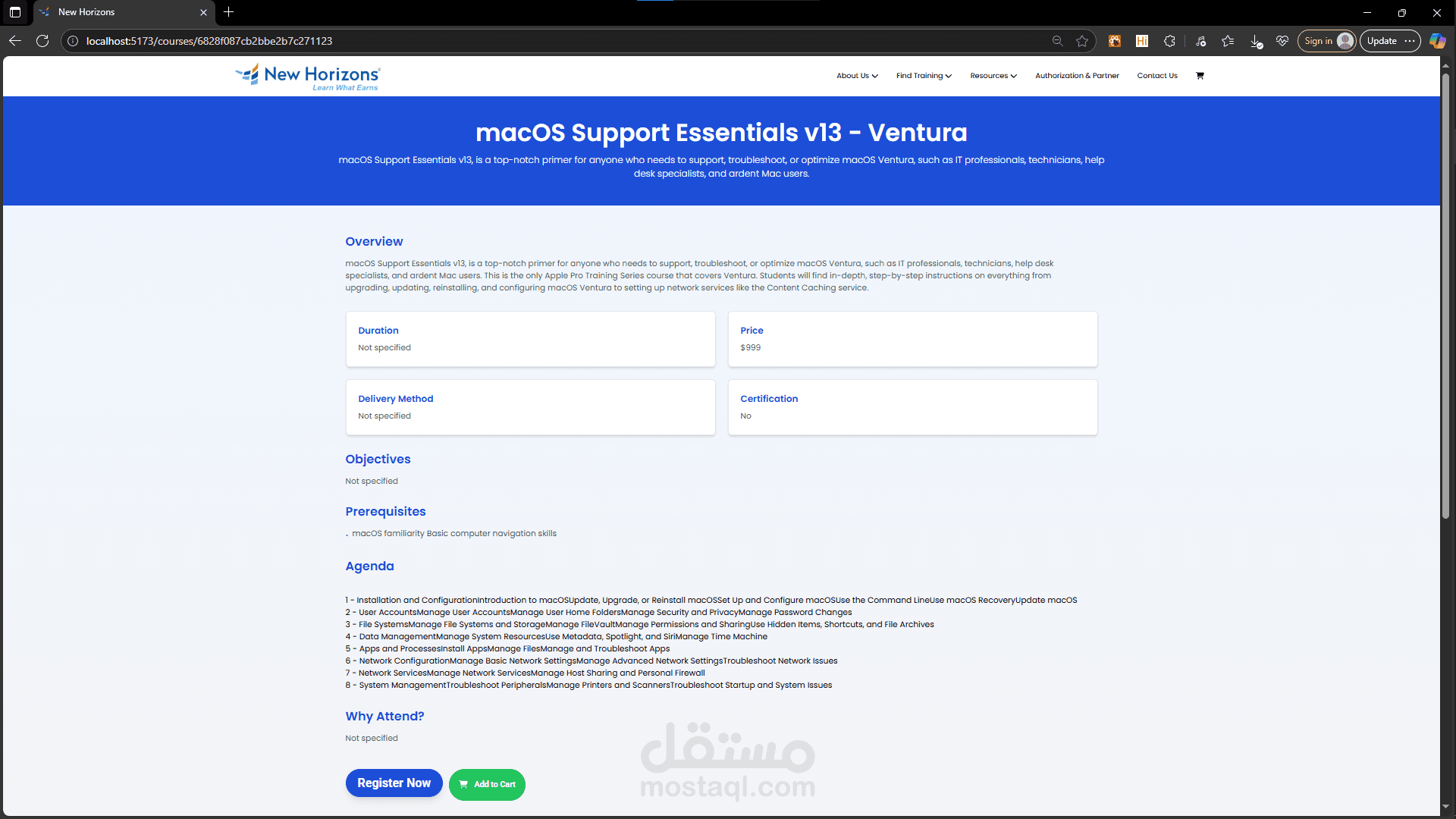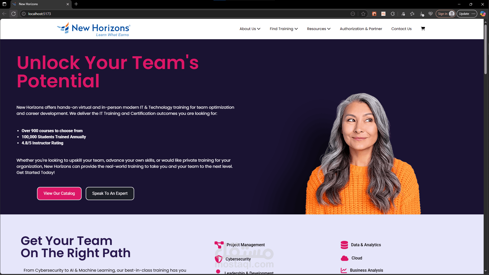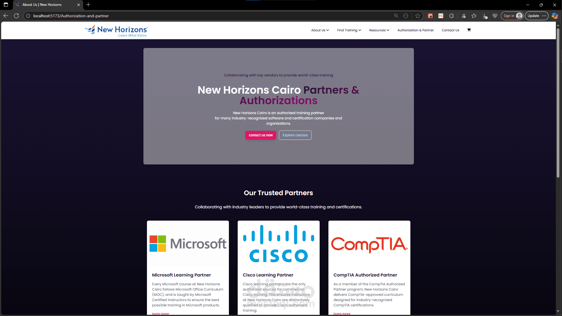 الصفحات الخاصة بالدورات، الشهادات، العروض، التدريب، الجداول الزمنية، والموارد (مثل: الويبينار، طرق التعلم، التوظيف، التحقق من الشهادات، المدونة).