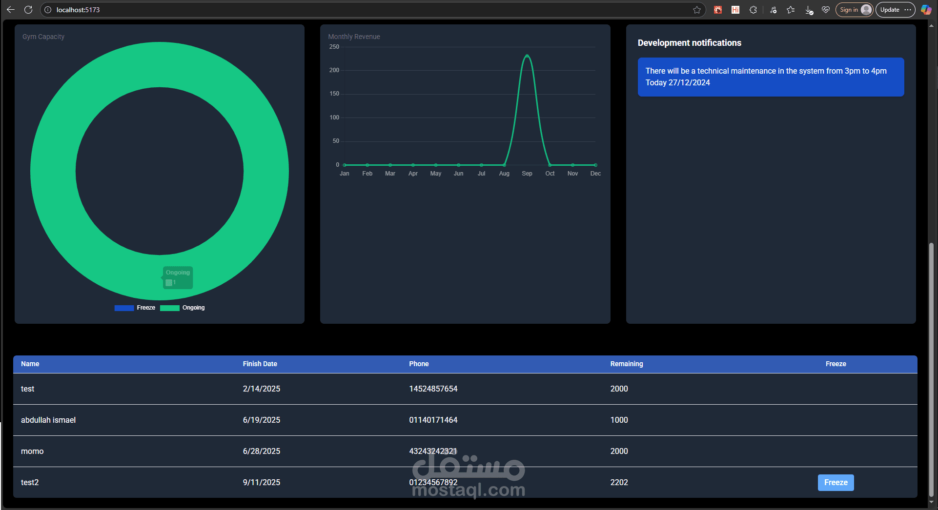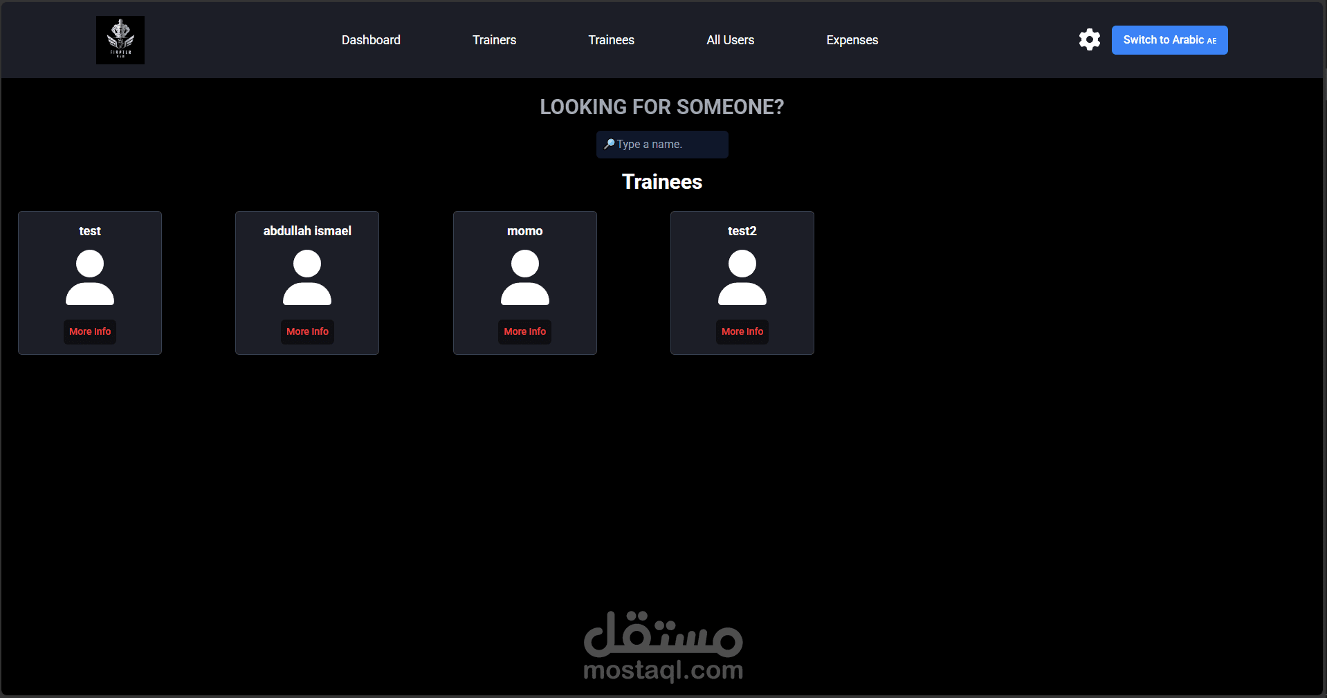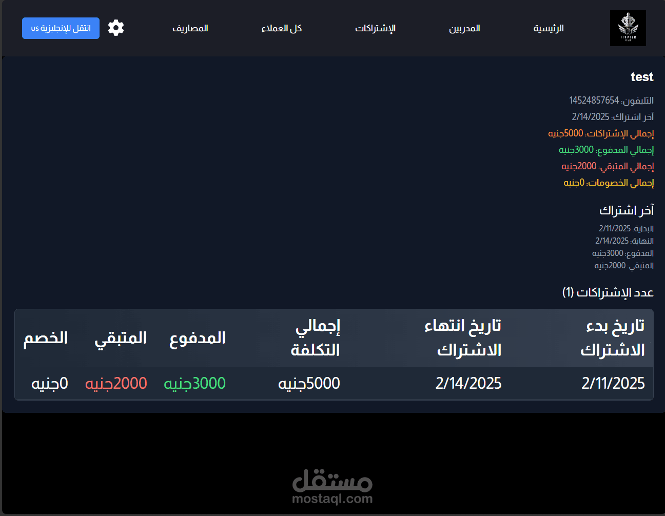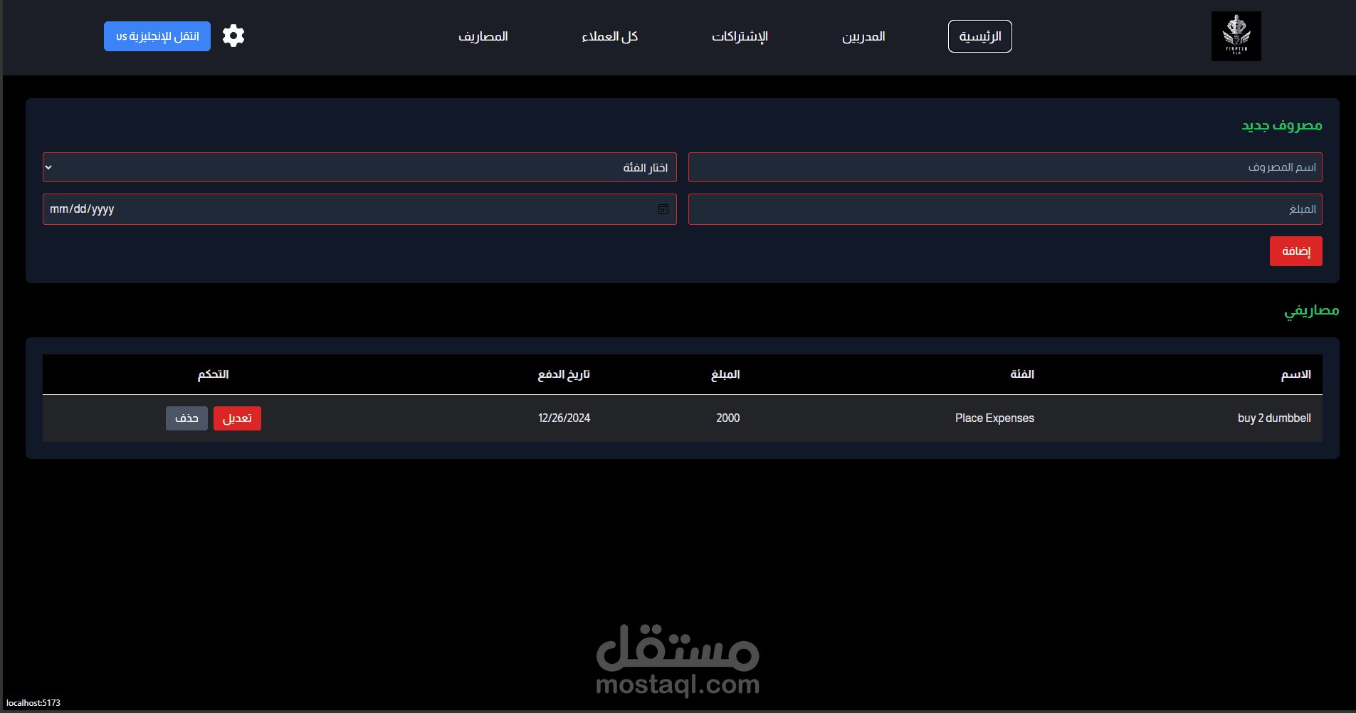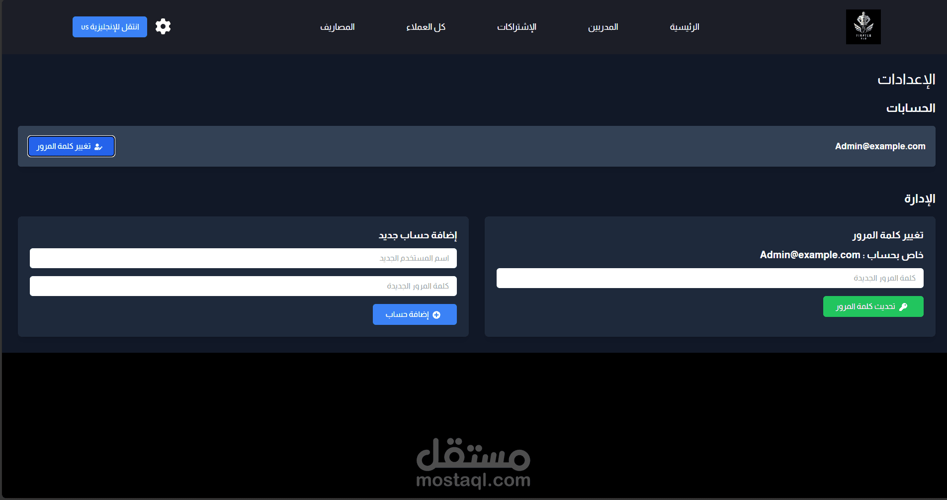 تطوير لوحة إدارة (Admin Panel): باستخدام React, Express, MongoDB لإدارة الحسابات، الاشتراكات، المدربين والمتدربين.