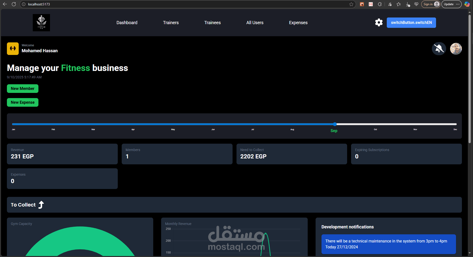 لوحة تحكم Dashboard: رؤية مركزية تشمل الأعضاء، المدربين، والإيرادات/المصروفات بواجهة سهلة الاستخدام.