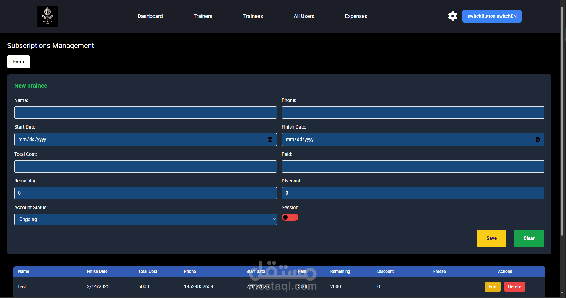 تسجيل وإدارة المتدربين مع بيانات شخصية واشتراكات.