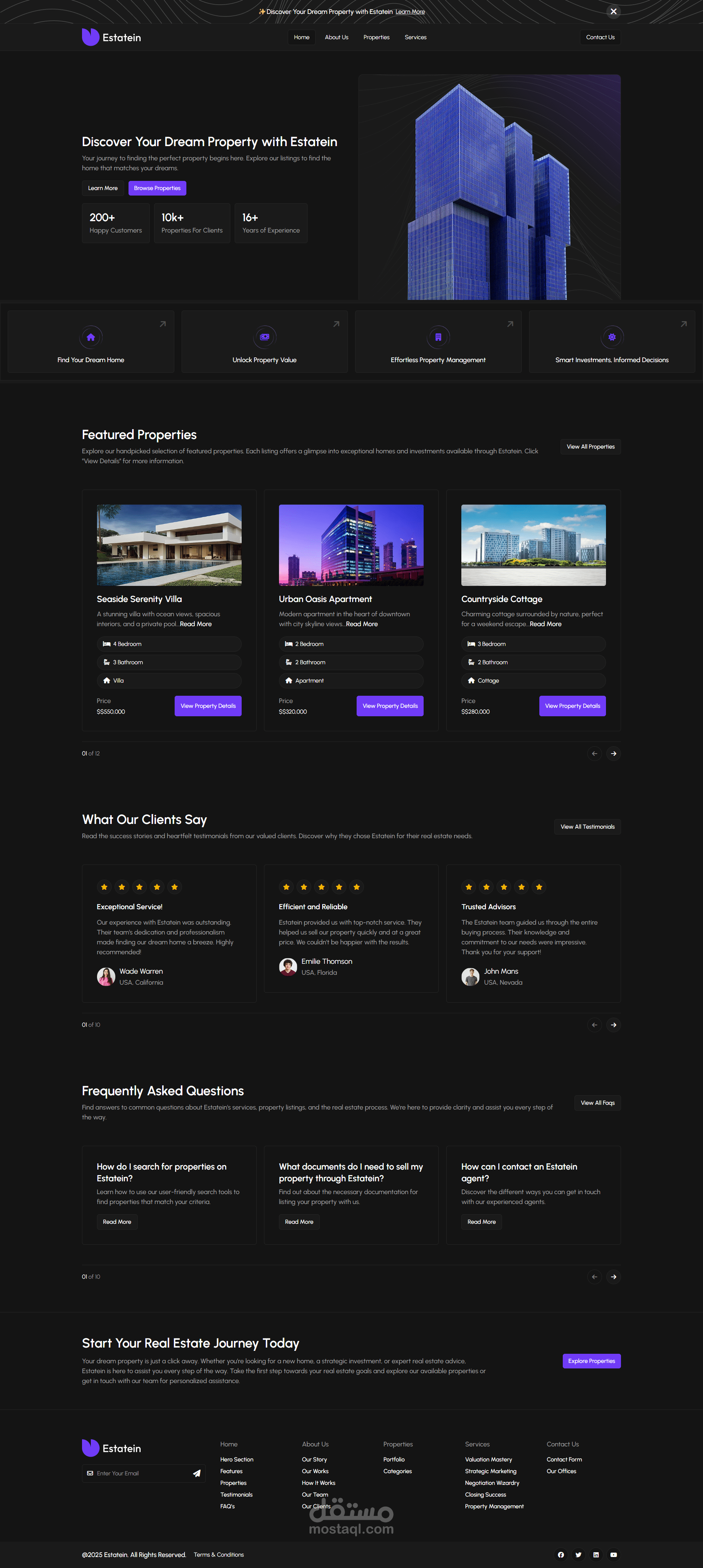 مشروع Estatein هو واجهة مستخدم (Front-End) لموقع عقاري تم تصميمه باستخدام React.js و Tailwind CSS. يهدف الموقع إلى عرض العقارات والخدمات العقارية بطريقة عصرية ومنظمة، مع التركيز على سهولة الاستخدام وتجربة مستخدم سلسة.