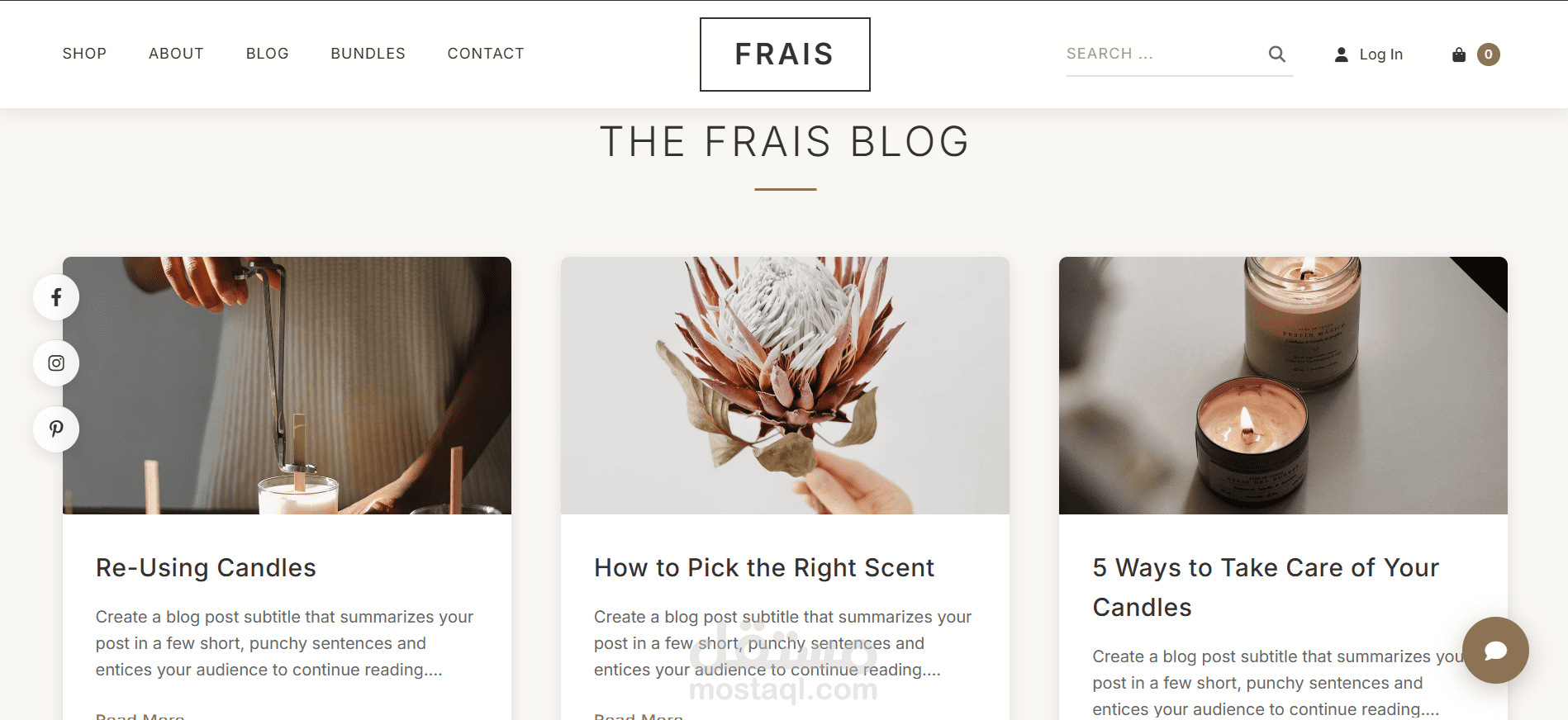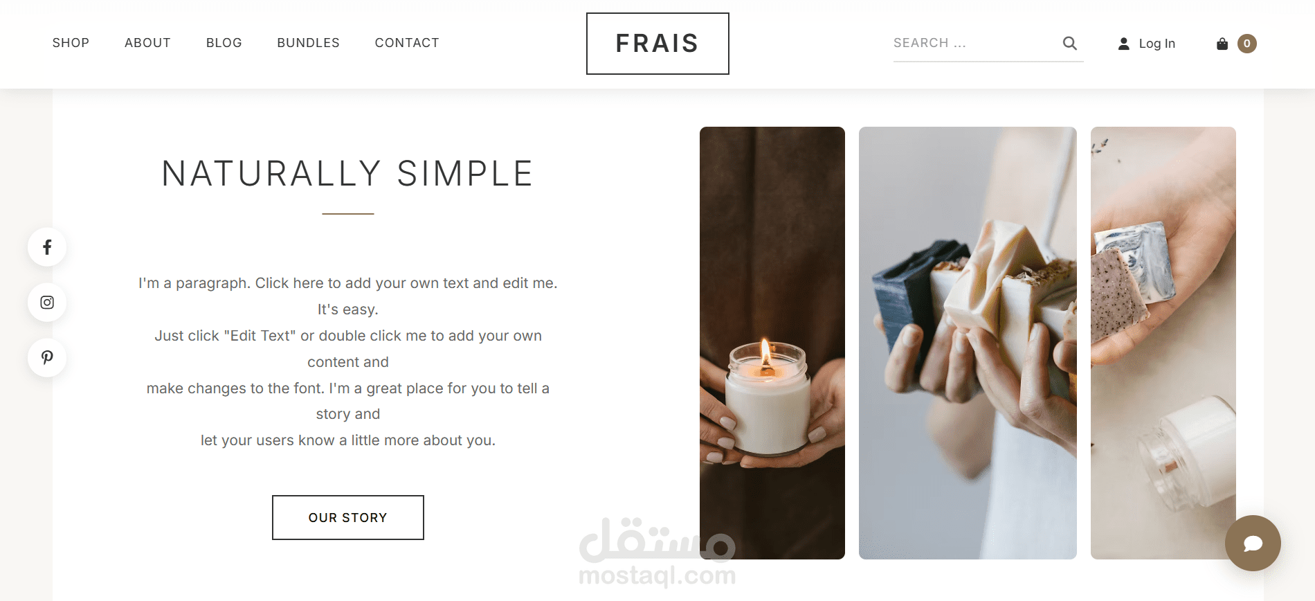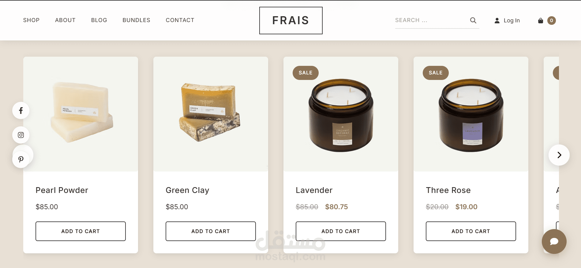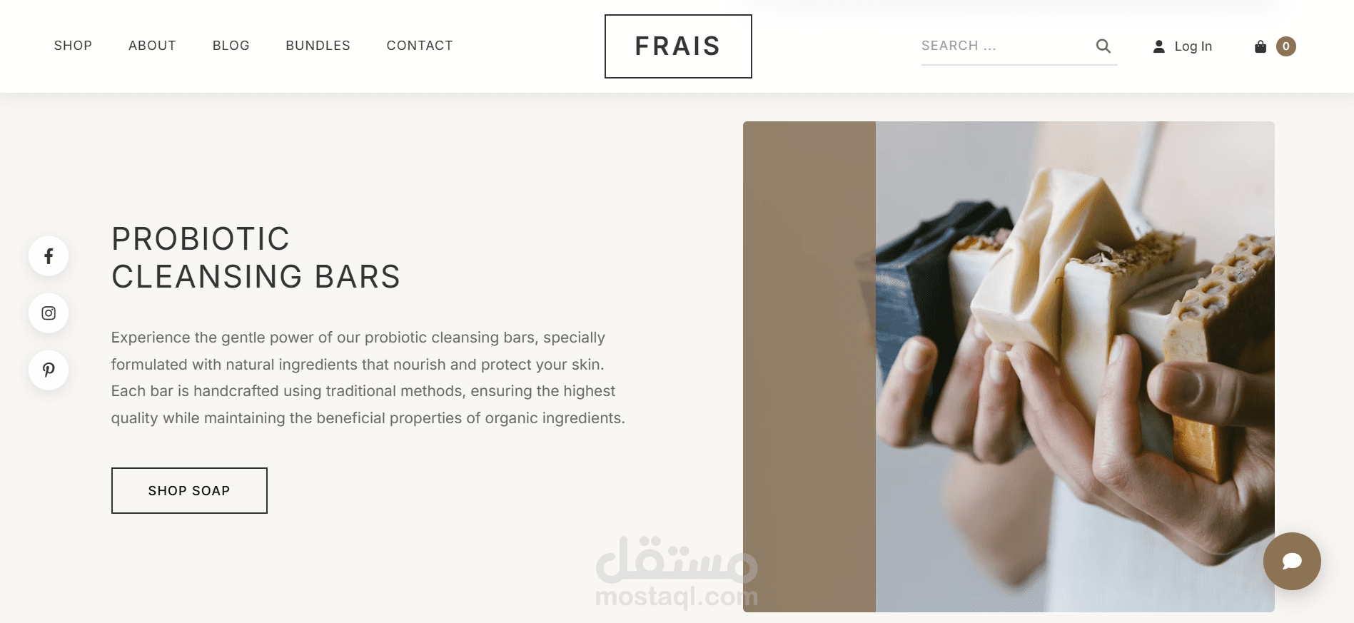 شريط تنقل منظم يضم روابط SHOP، ABOUT، BLOG، BUNDLES، CONTACT، إلى جانب أيقونة تسجيل الدخول وعربة التسوق.