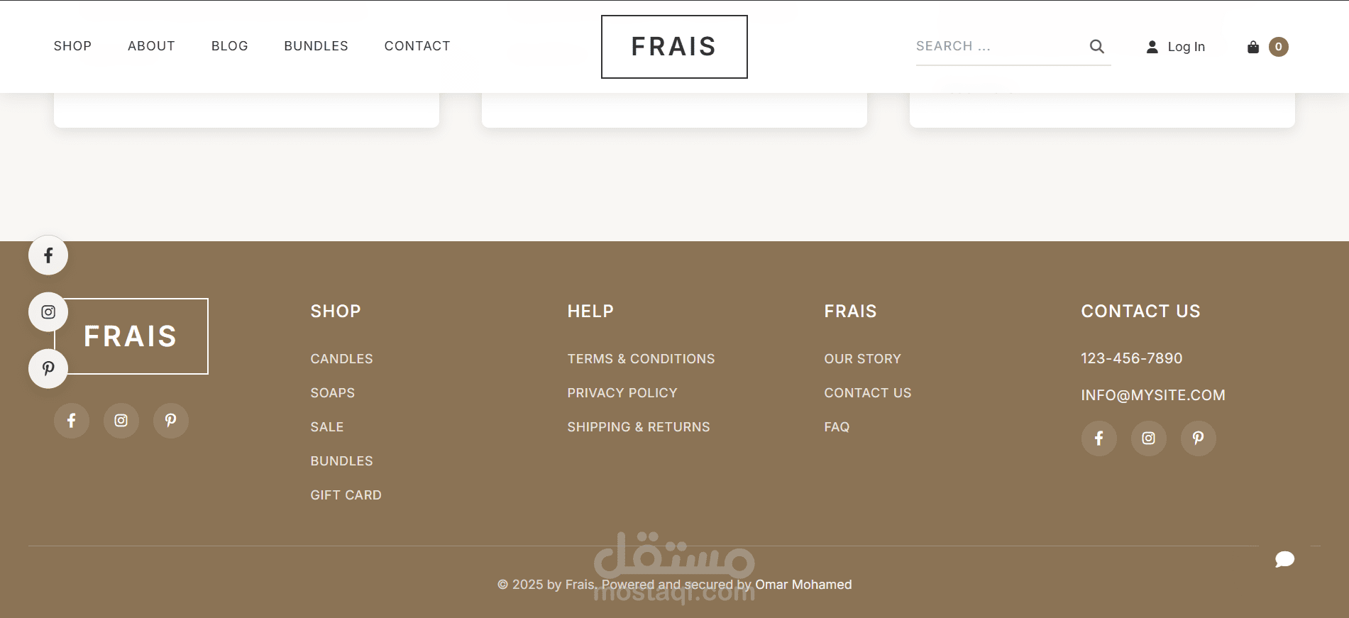 تذييل متكامل يشمل روابط للمتجر، المساعدة، معلومات عن FRAIS، وسائل التواصل، وشعار "© 2025 by Frais. Powered and secured by Omar Mohamed."